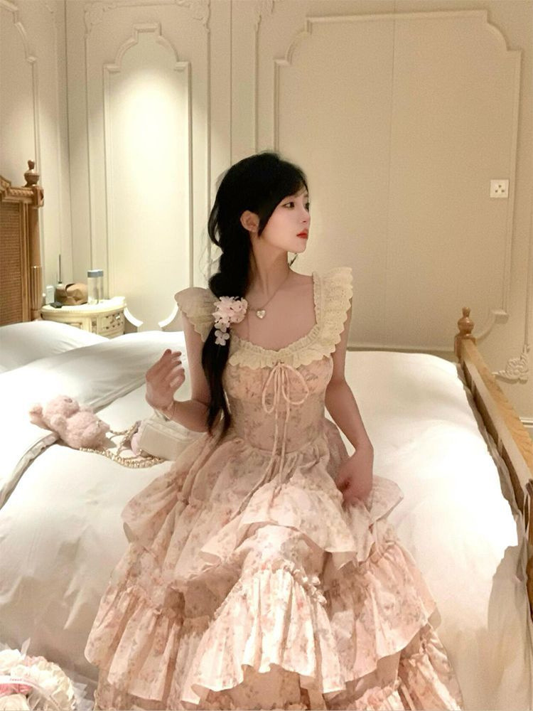 さくら織花リン絶妙な2025夏甘い小さなフライングスリーブ優しい花柄ウエストプリンセスケーキドレス
