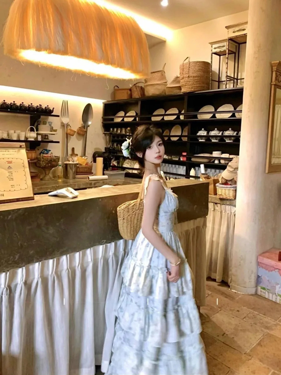 夏のドーパミン海辺の休暇の服装、写真撮影、絶妙なスカート、サスペンダー、ブルーのレトロなドレス
