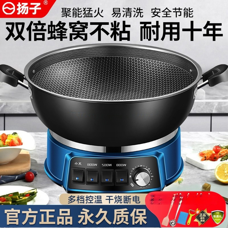 揚子ハニカムノンスティック電気中華鍋、炒め物、蒸し物、煮物用オールインワン電気鍋、ハイパワー多機能家庭用電気鍋