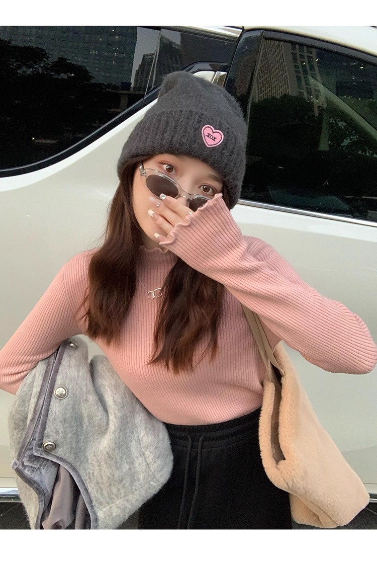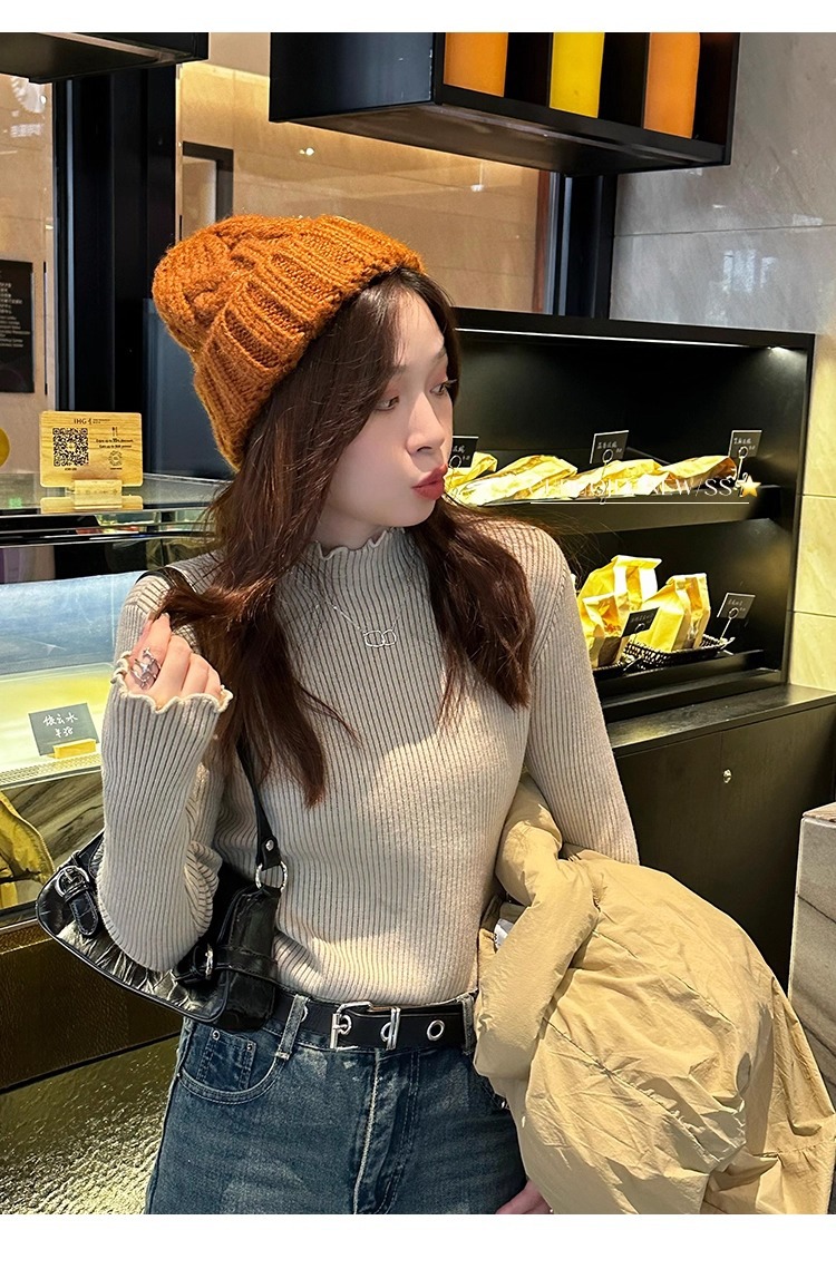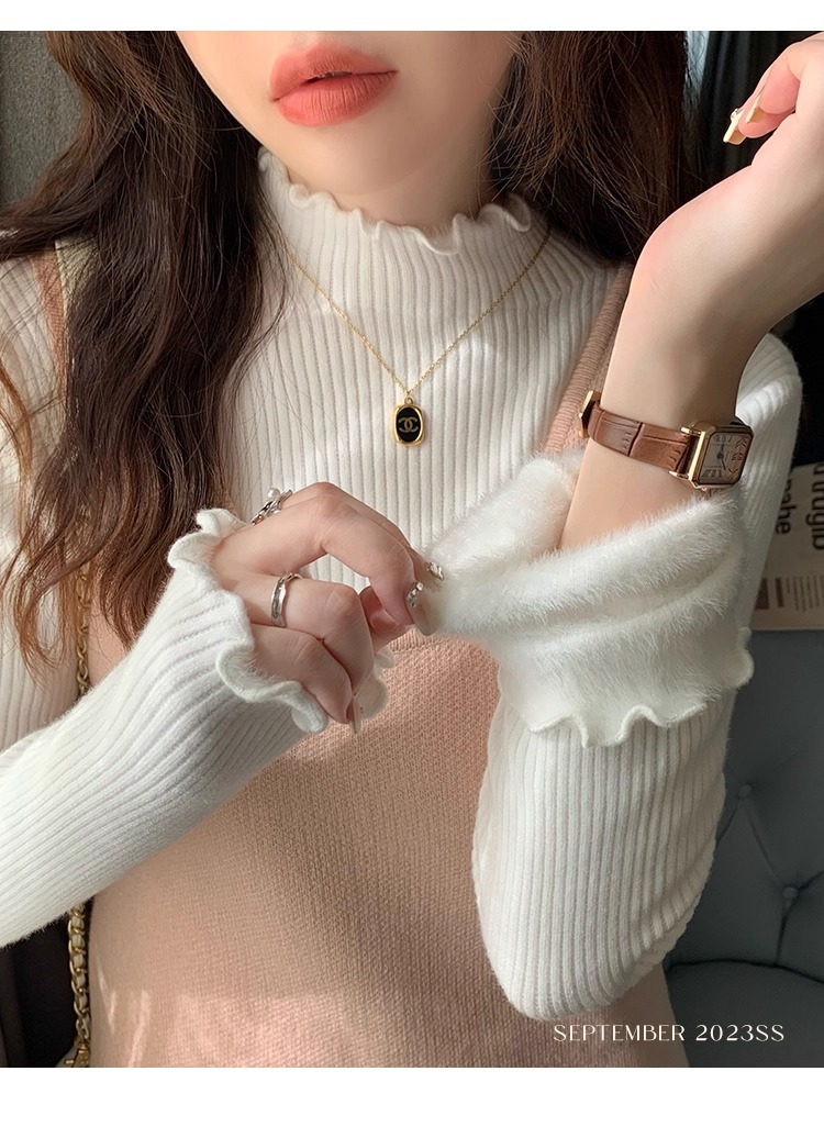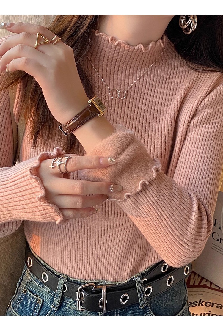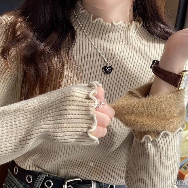 加绒加厚一体绒针织打底衫女木耳边半高领毛衣秋冬季长袖内搭上衣