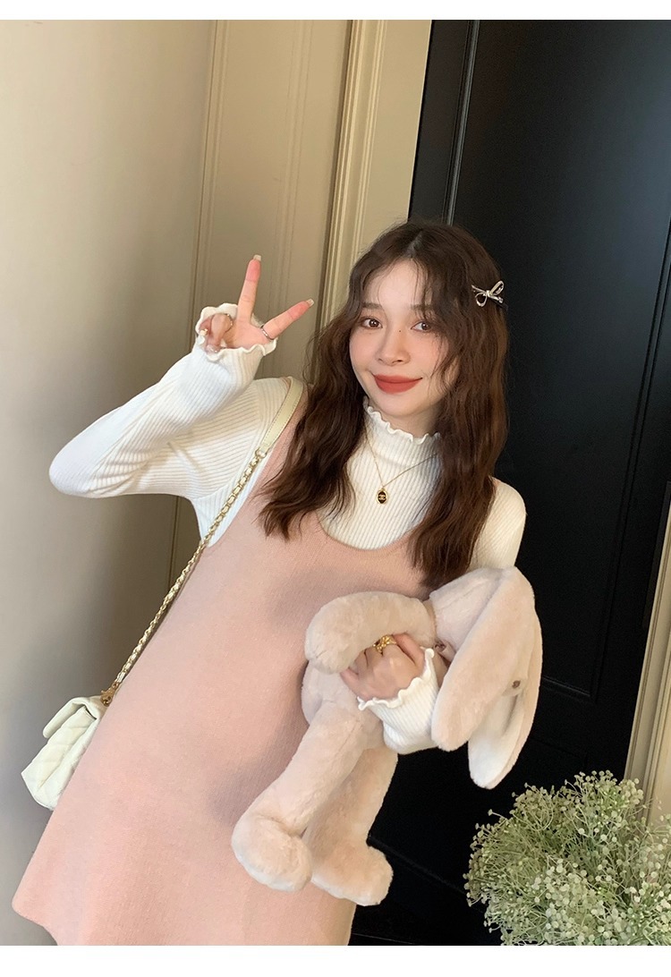 粉色毛衣女款2025新款秋冬半高领加绒内搭针织衫木耳边打底衫上衣