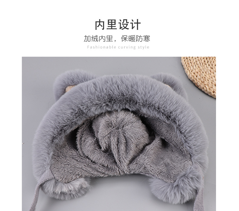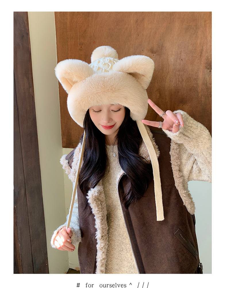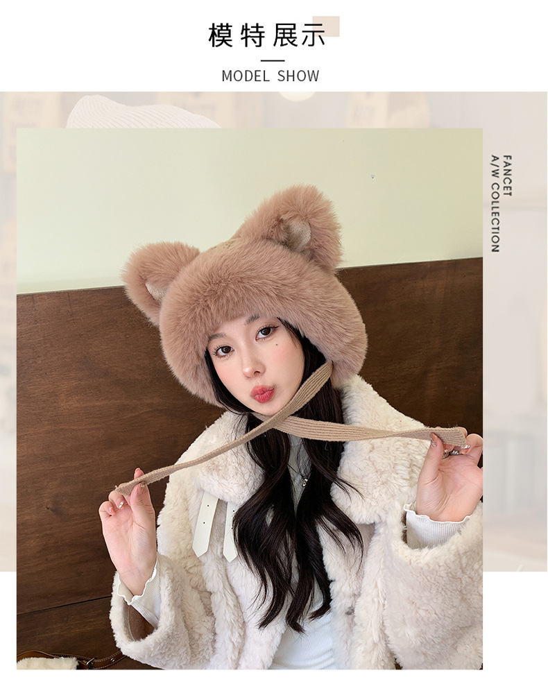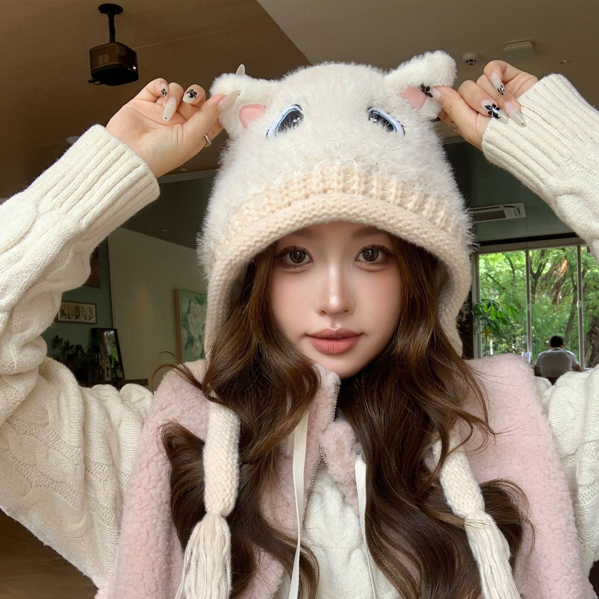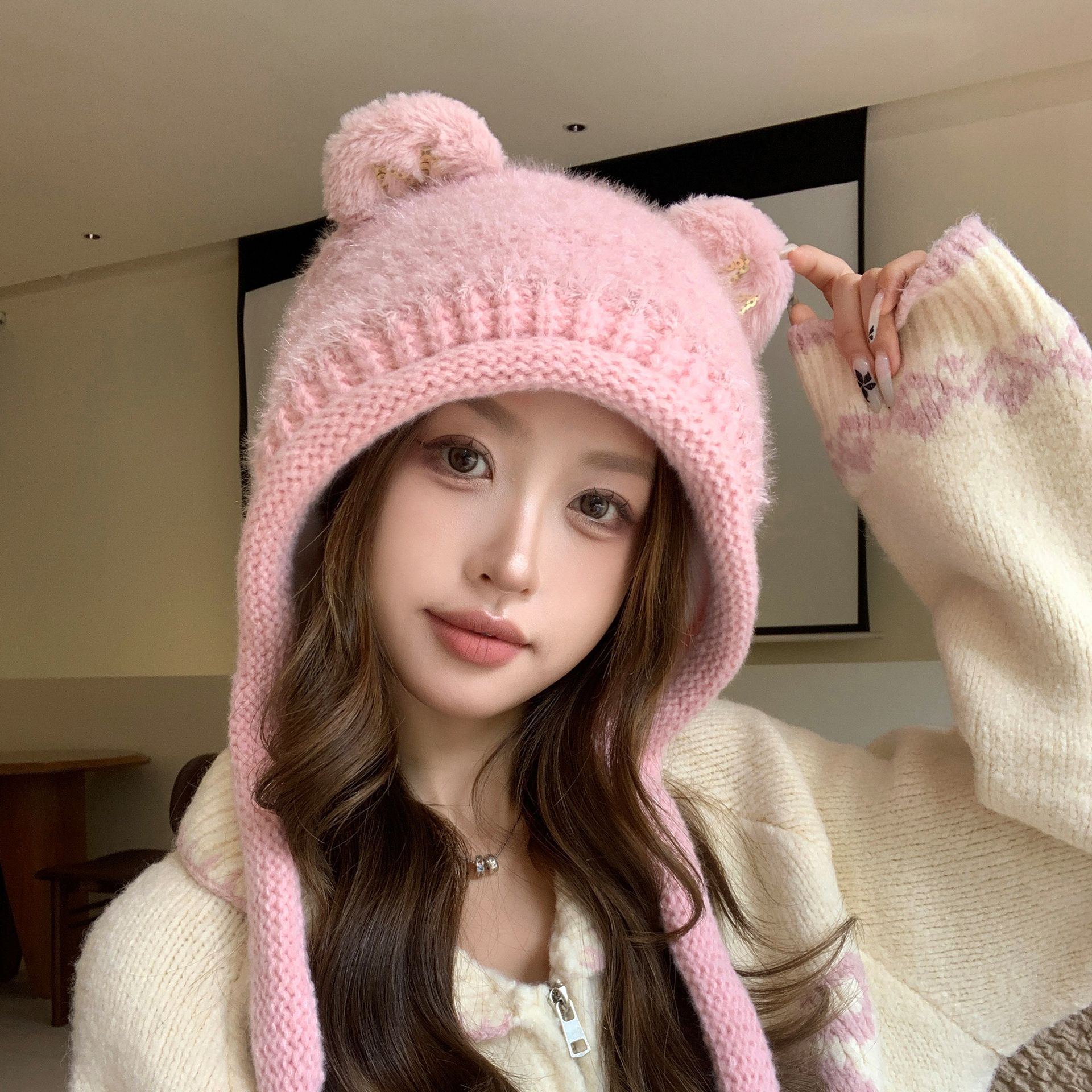 韓国版の新しい秋と冬のニットぬいぐるみ暖かい耳保護帽子女性用、キュートで甘い耳プルオーバーウール帽子トレンディ