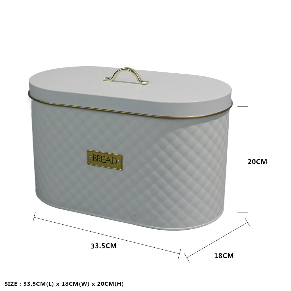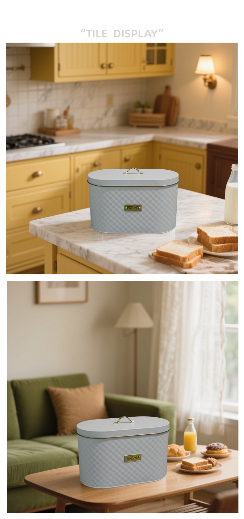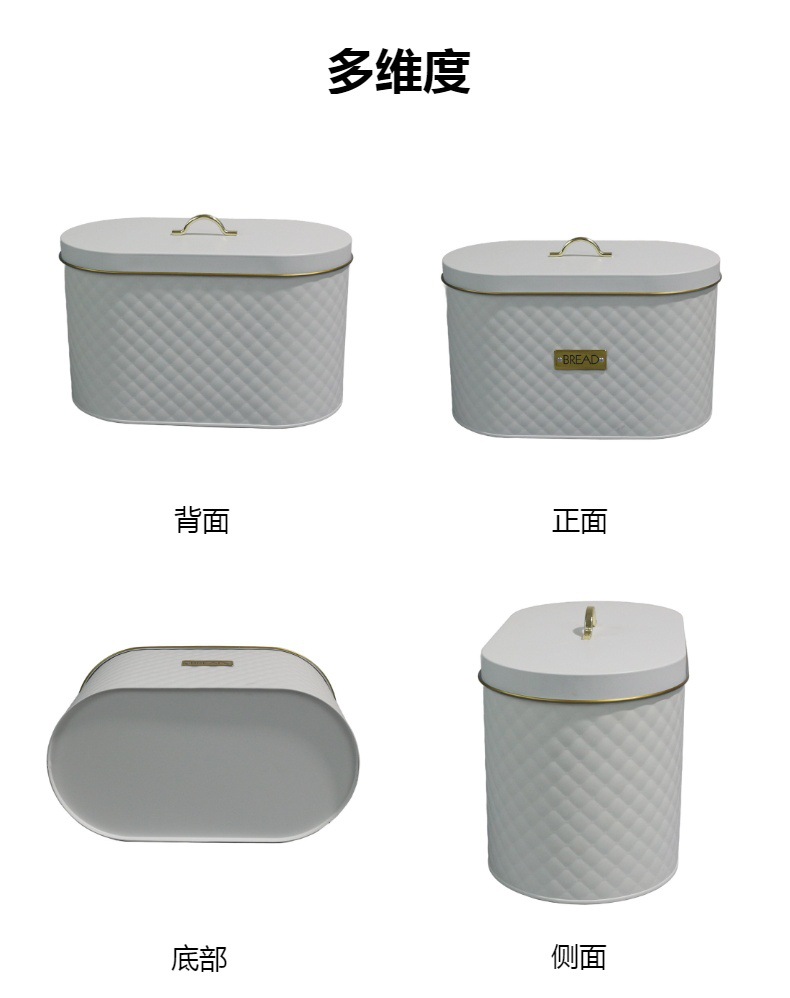 产品描述:这是一款精致的面包储存盒,外观为优雅的椭圆形,采用金属材质打造。表面带有菱形纹理,搭配金色装饰线条与提手,质感十足。盒身设有 “BREAD” 标识,简约又具设计感,可放置于厨房、餐厅或客厅,用来存放面包、糕点等,既防尘保鲜,又能为空间增添时尚氛围,是实用与美观兼具的家居小物 。