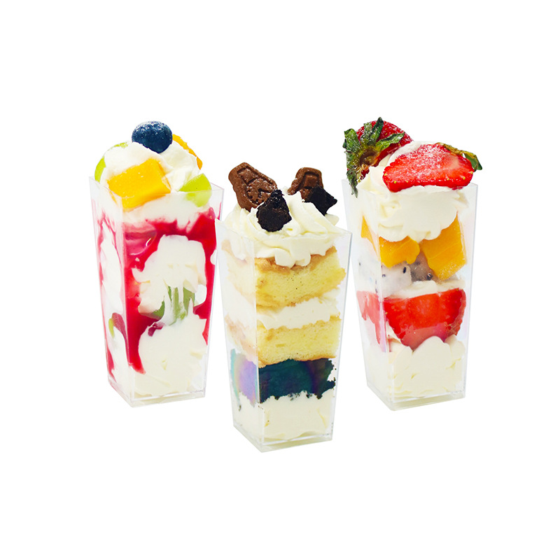 国境を越えた人気の 3 オンスの蓋付き正方形ムースカップ、プラスチック製のアイスクリームカップ、プリンカップ、前菜、デザート、デザートカップ