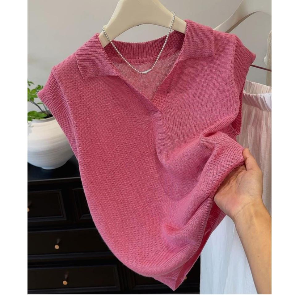 フランス式の軽い贅沢な風は美しいピンクの丸首のニットの袖なしのtシャツの女性の夏のタイプの独特な超美しい年齢の上着を減らします。