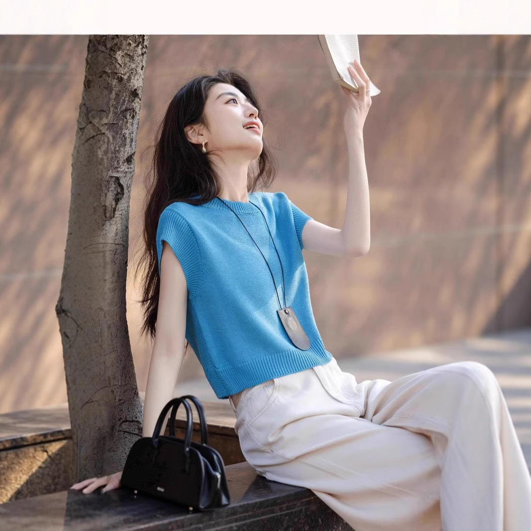 ヨーロッパ商品 2025 新製品ソリッドカラー多用途半袖アイスシルクセーター女性の夏薄いラウンドネック半袖スリムトップ