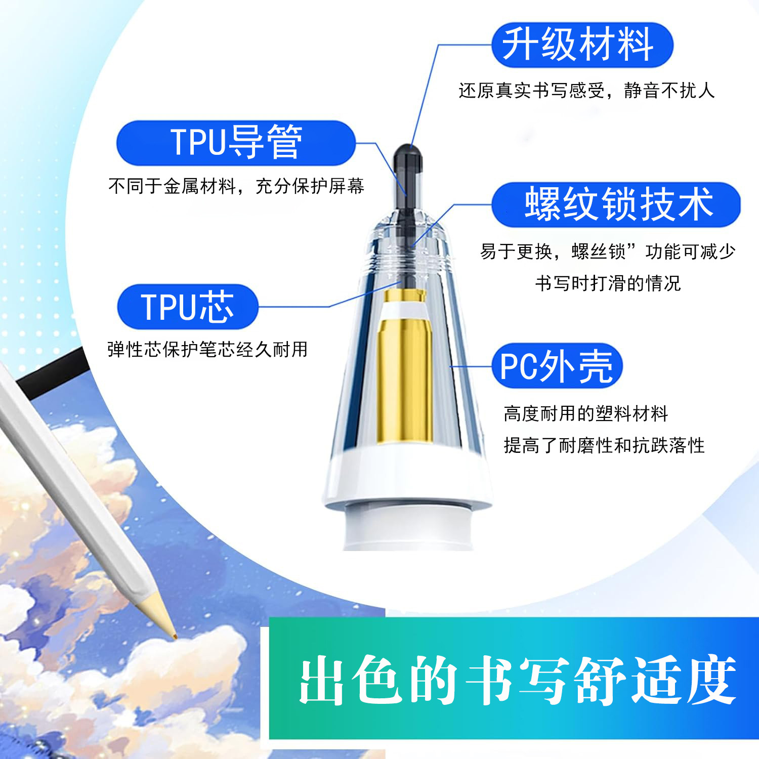 Apple Pencil 第 1 世代および第 2 世代の Pro iPad ペンシルチップに適しており、静かで滑りにくく耐摩耗性があります。