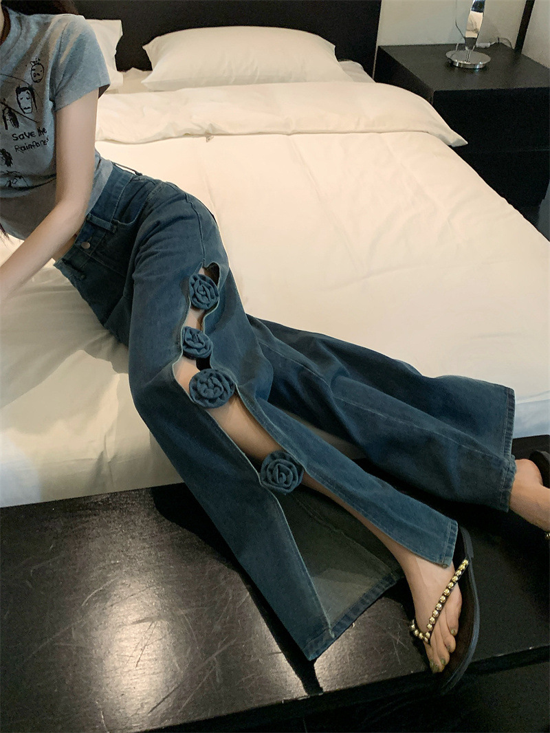 デザインホットガール中空スリットジーンズ手作り立体花ルーズワイドレッグパンツロングパンツ夏の新スタイル