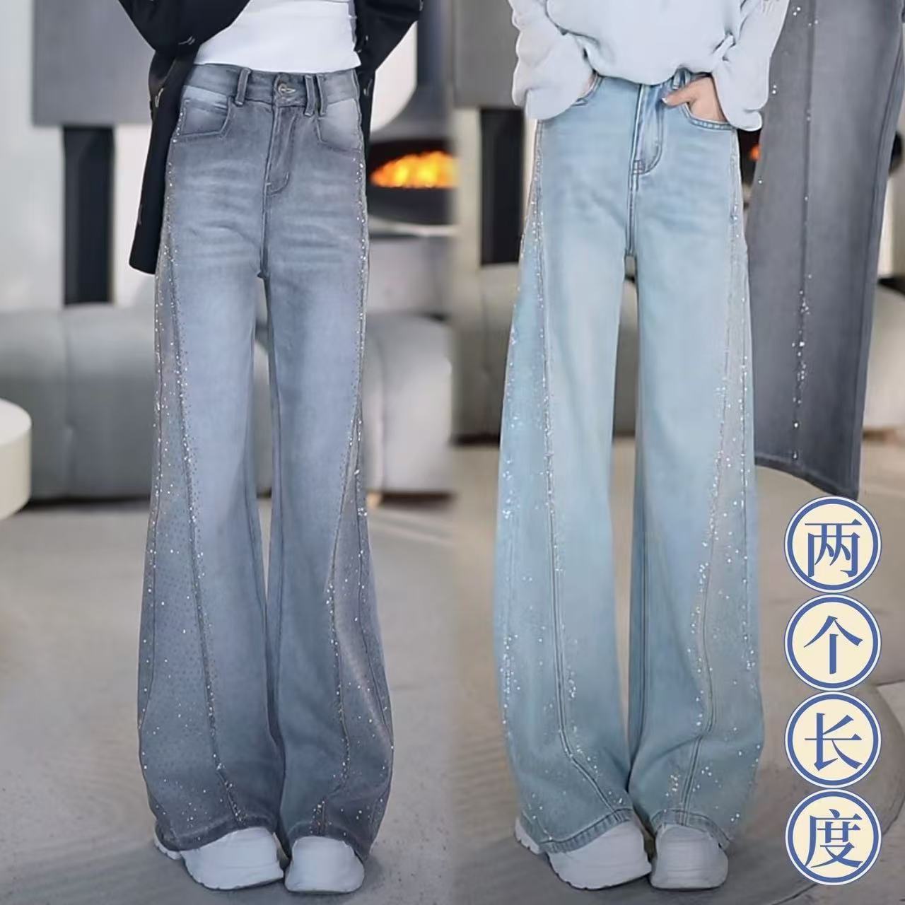 ホットダイヤモンドジーンズレディース2025春夏新デザインハイウエスト重工業明るいダイヤモンドルーズストレートワイドレッグフロアモップパンツ