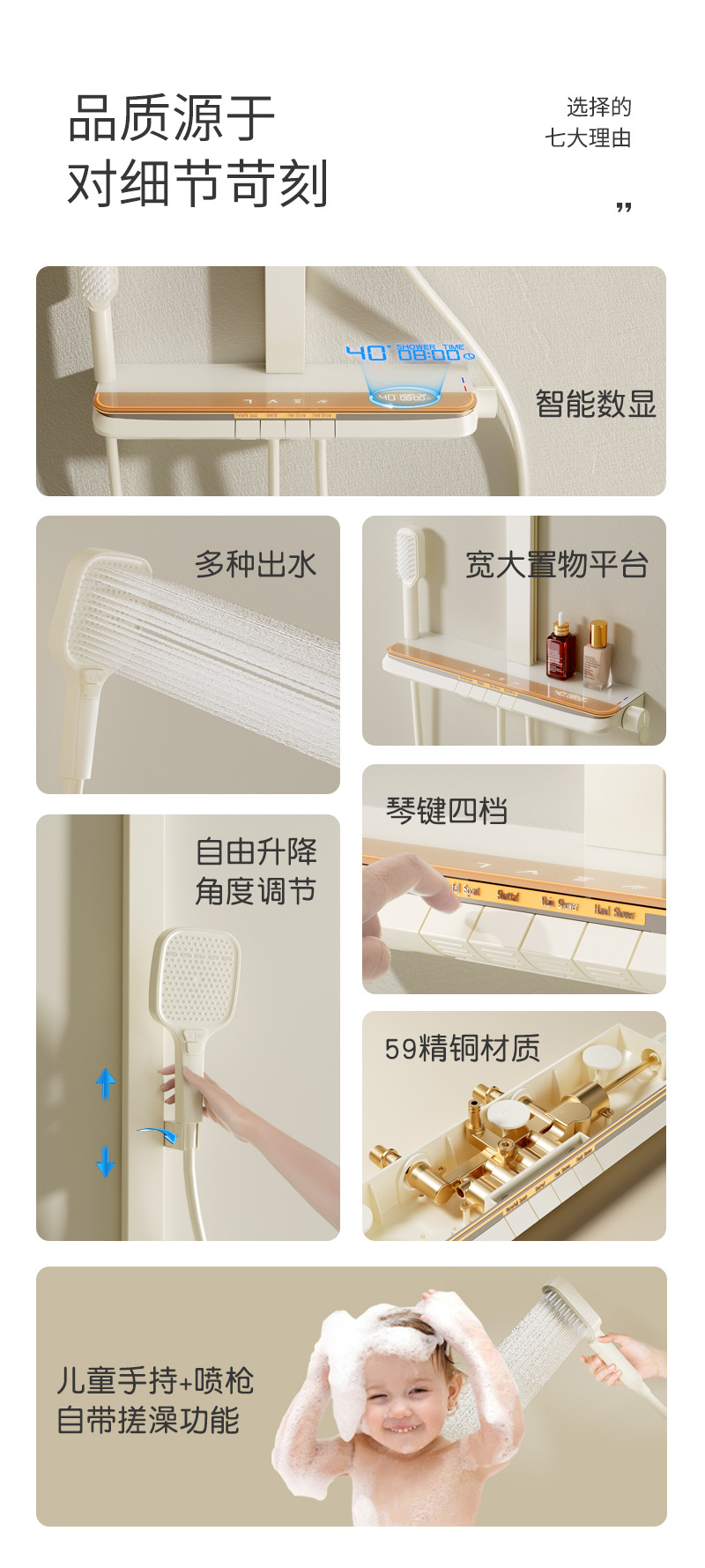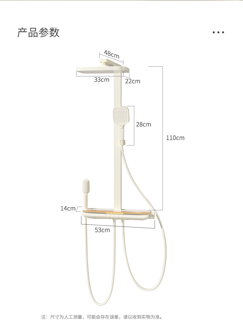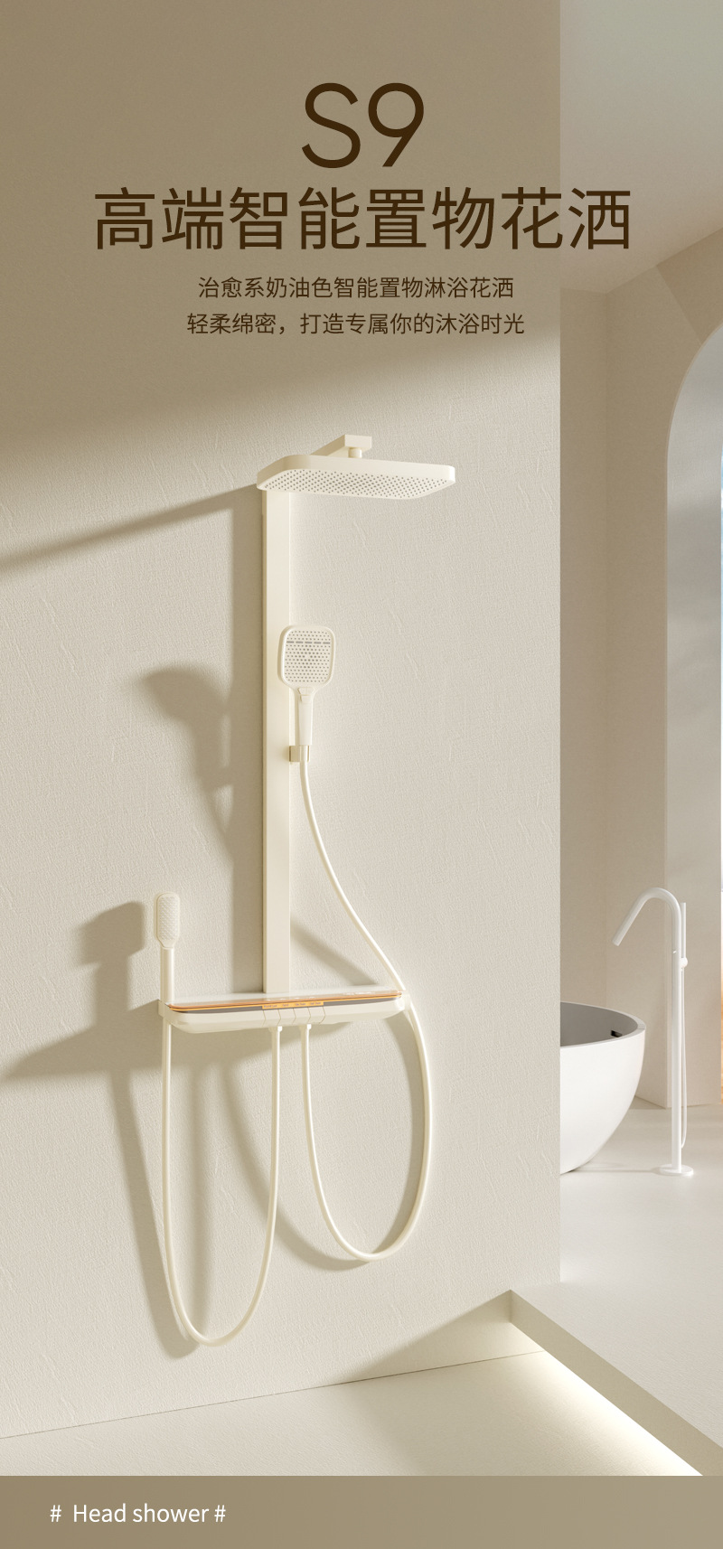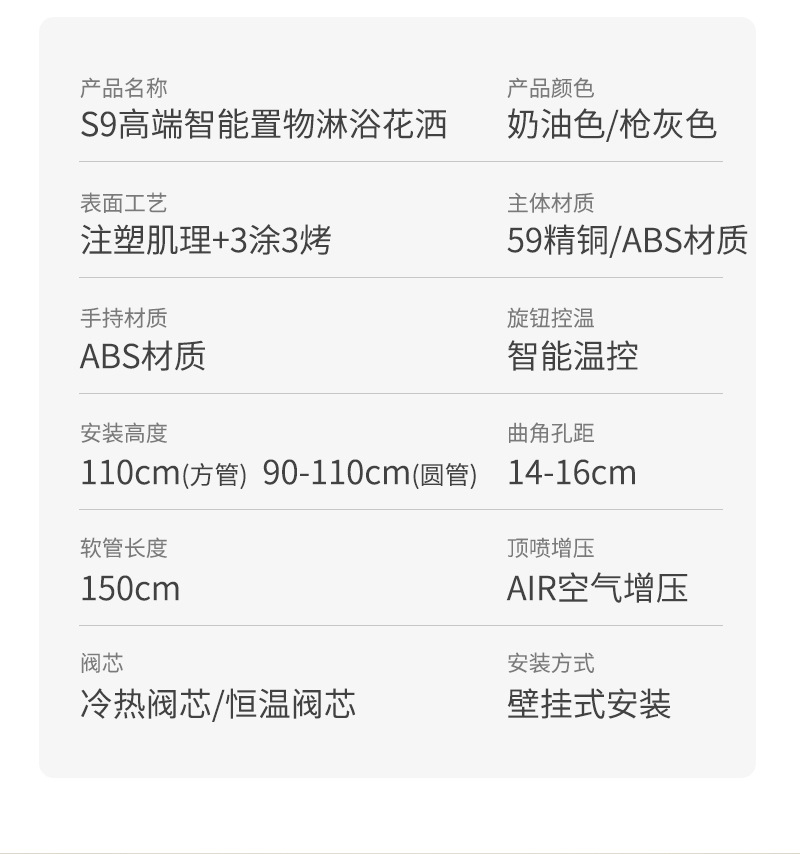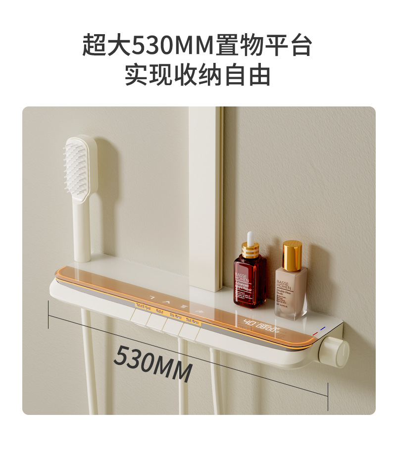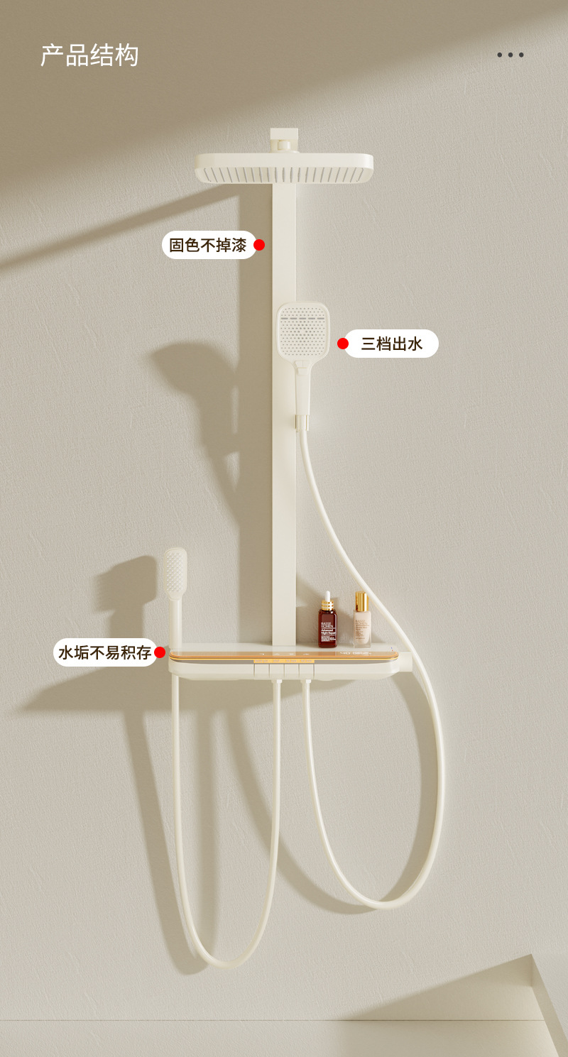 丽雅S9高端智能花洒奶油色淋浴花洒套装简约氛围灯数显大置物花洒