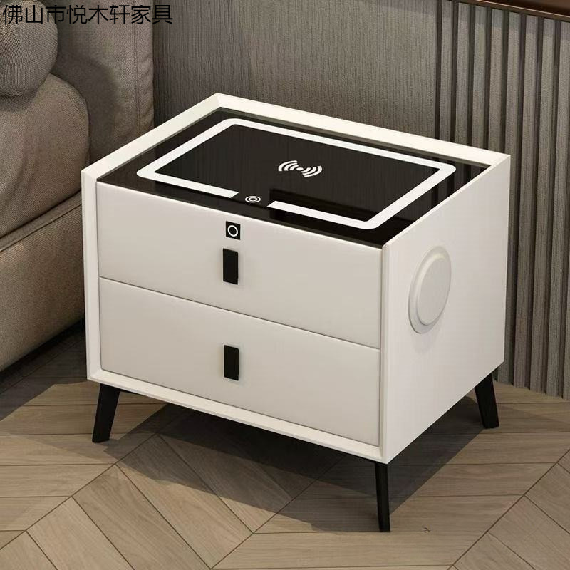 無垢材スマートベッドサイドテーブルモダンシンプルライト高級インターネット有名人多機能ライト指紋ロック付きBluetoothオーディオベッドサイドテーブル