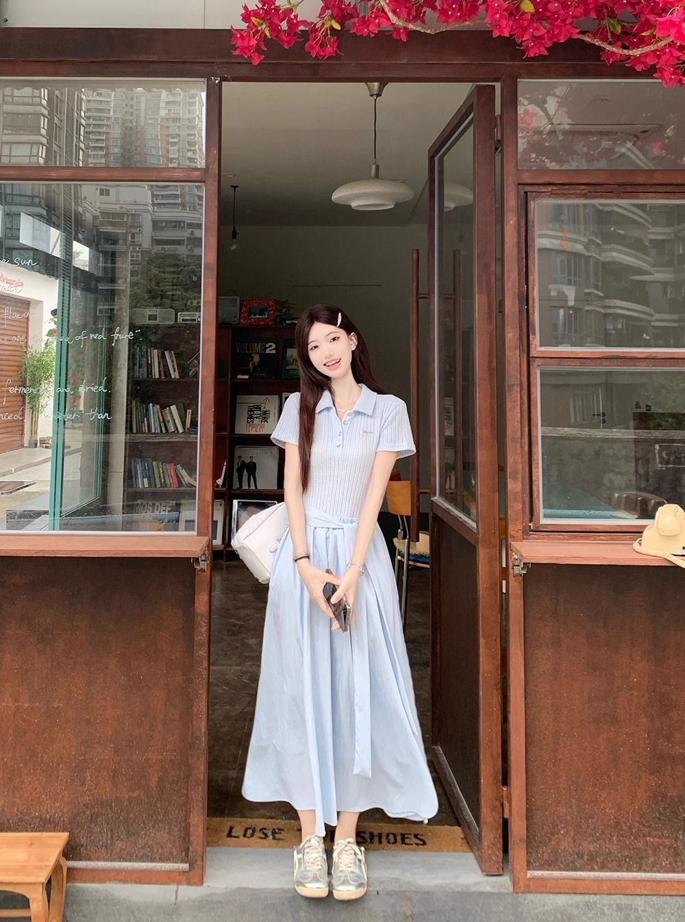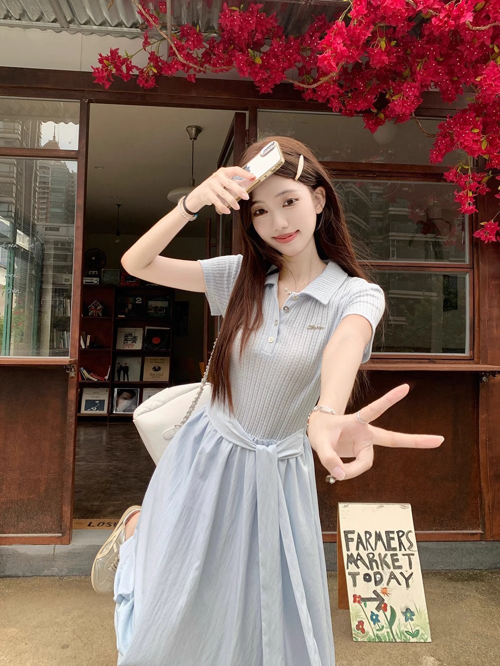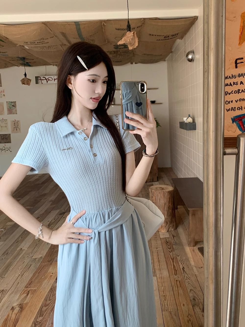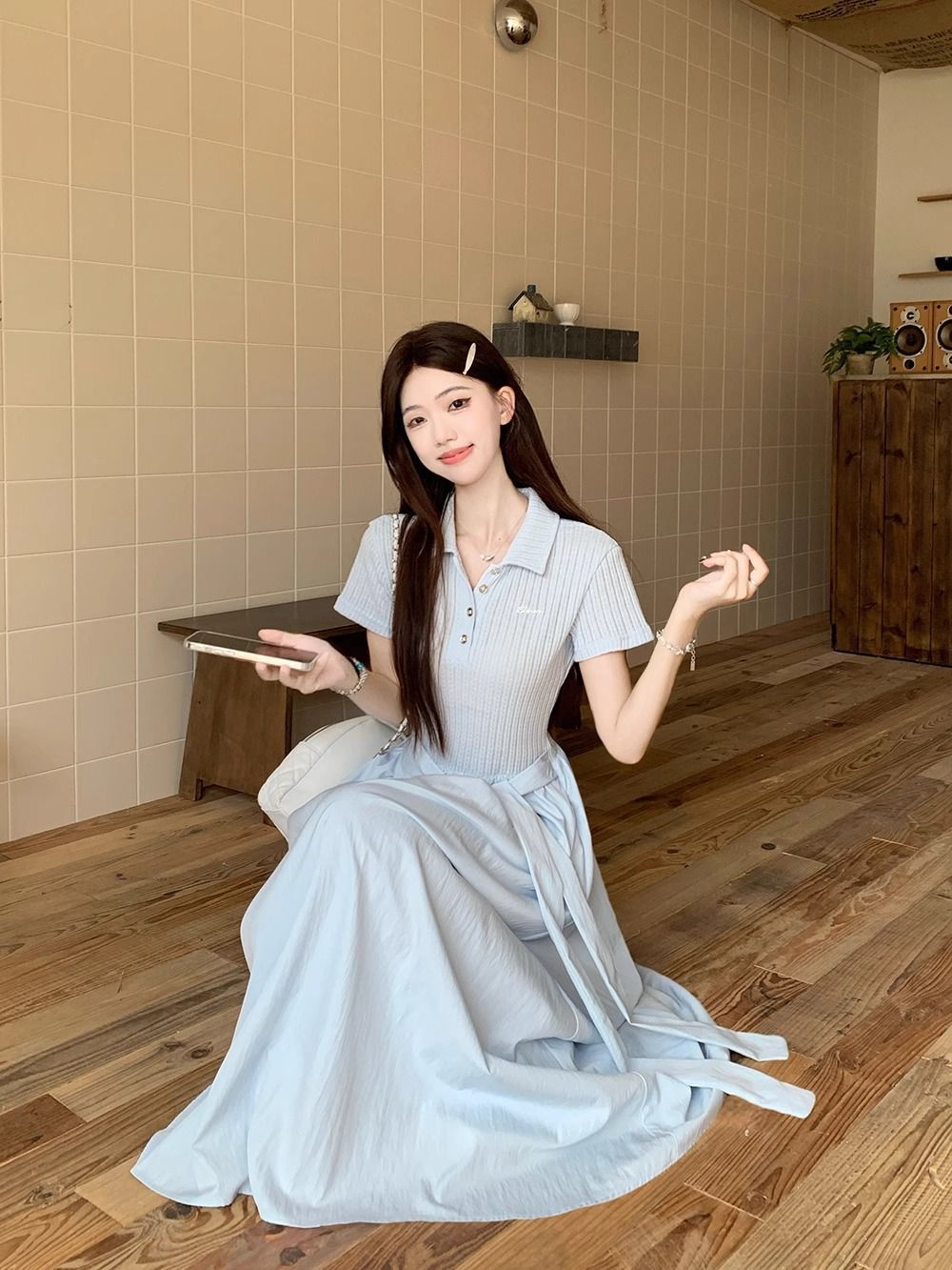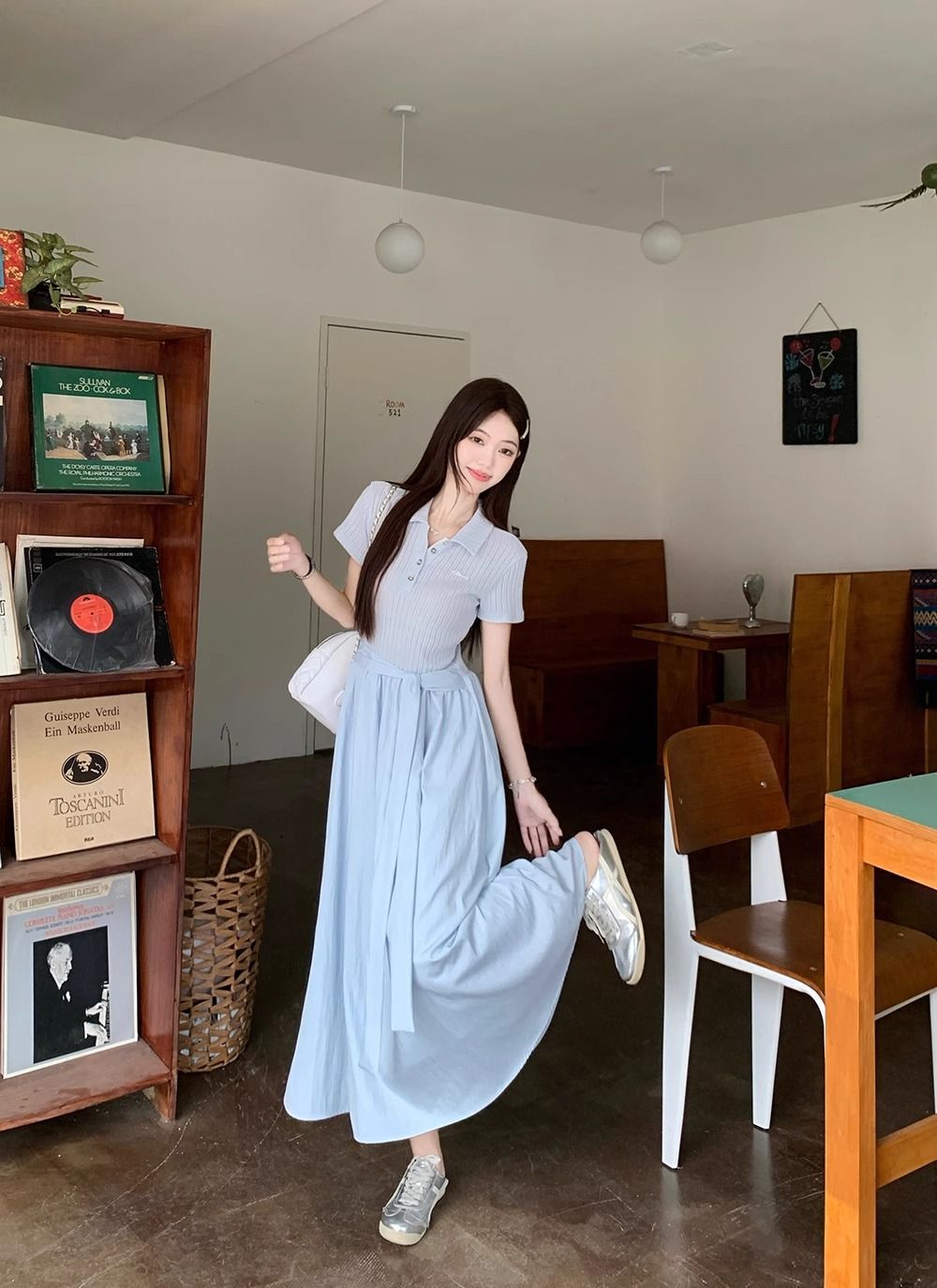 韓国ポロカラーストラップ半袖ドレス女性の夏ニッチウエストユニークな美しいブルーのAラインロングスカート