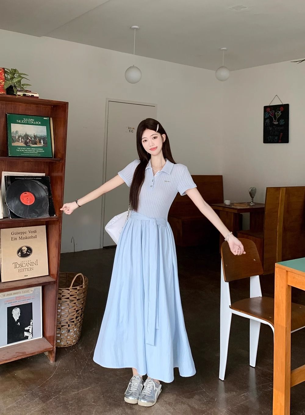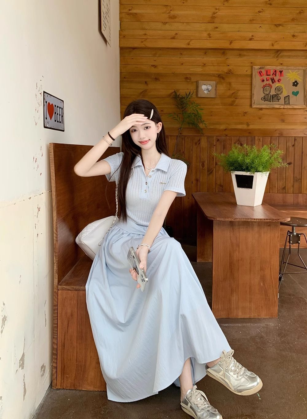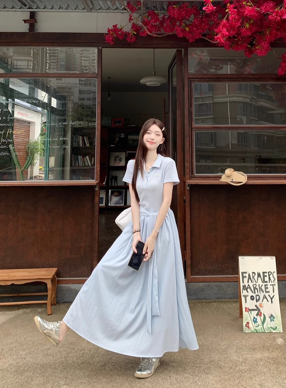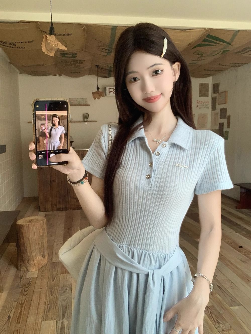 韓国ポロカラーストラップ半袖ドレス女性の夏ニッチウエストユニークな美しいブルーのAラインロングスカート