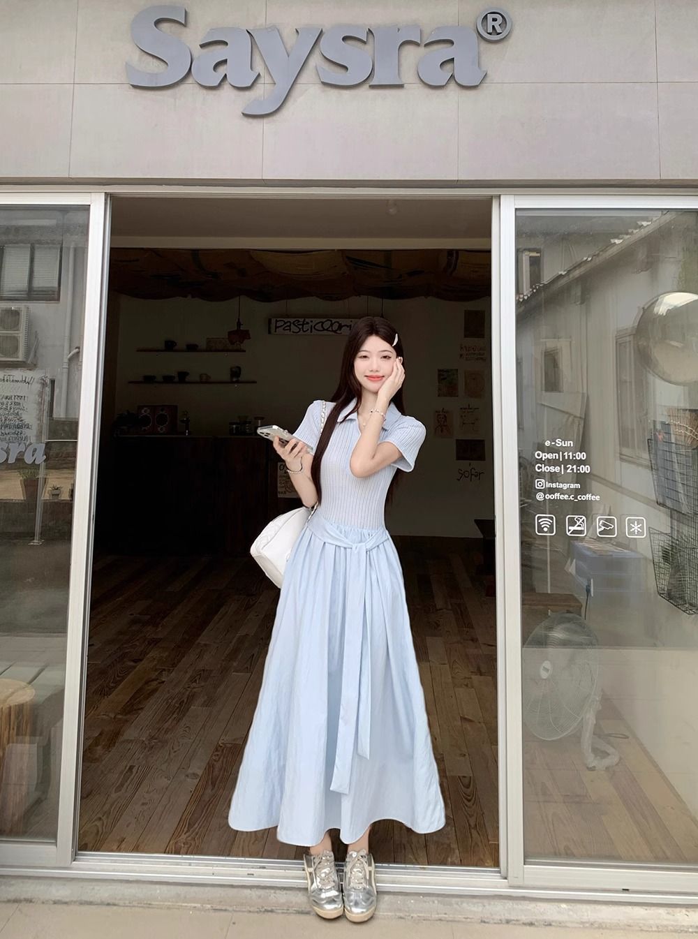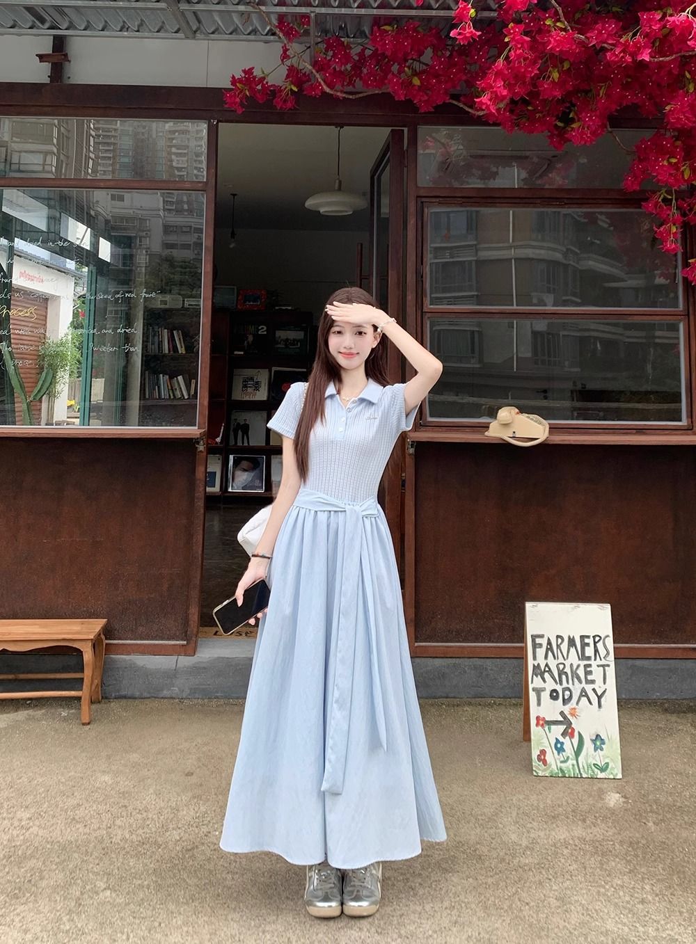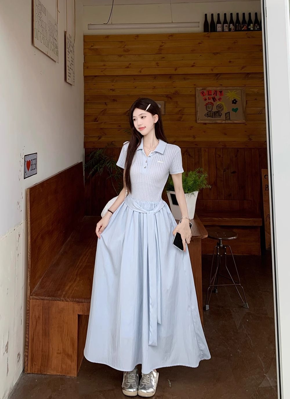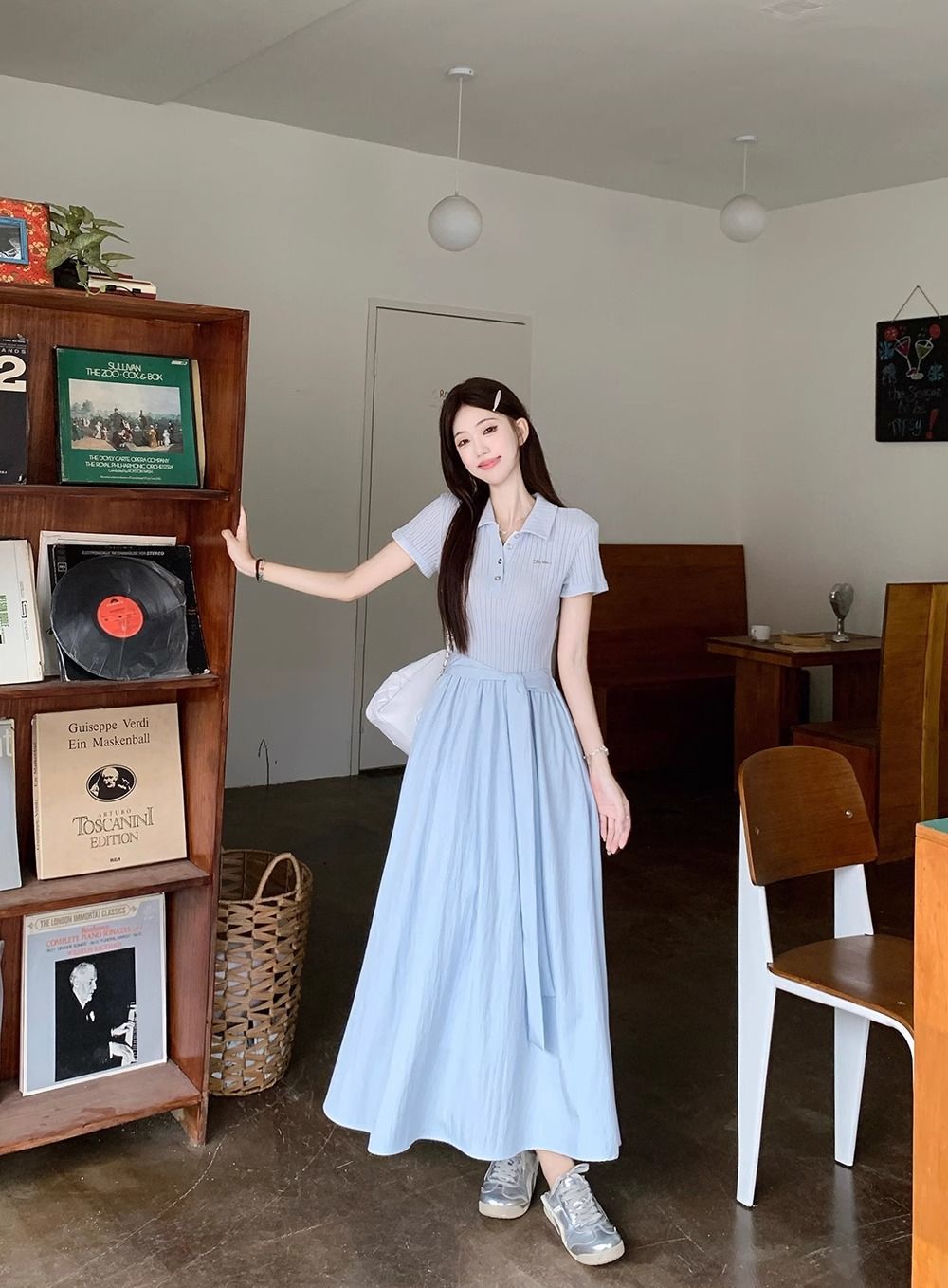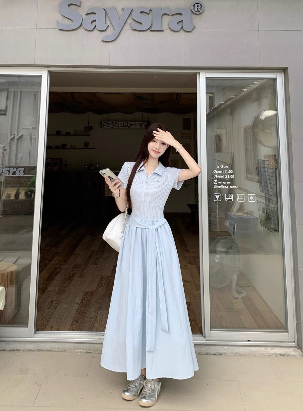 韓国ポロカラーストラップ半袖ドレス女性の夏ニッチウエストユニークな美しいブルーのAラインロングスカート