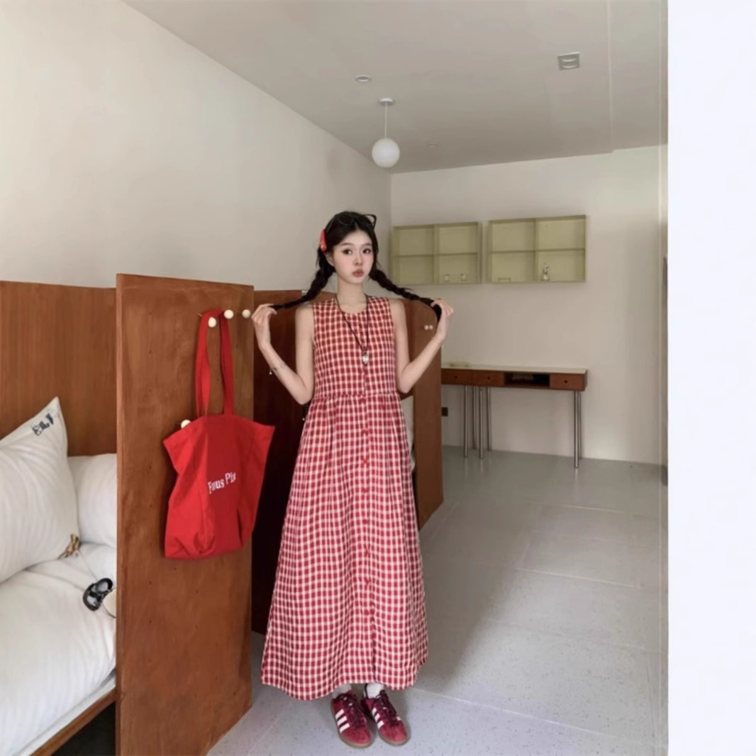 甘い辛い赤い格子のノースリーブのベストのワンピースの女性の春の2025新型のゆったりした単列のボタンの怠惰な風の長いスカート