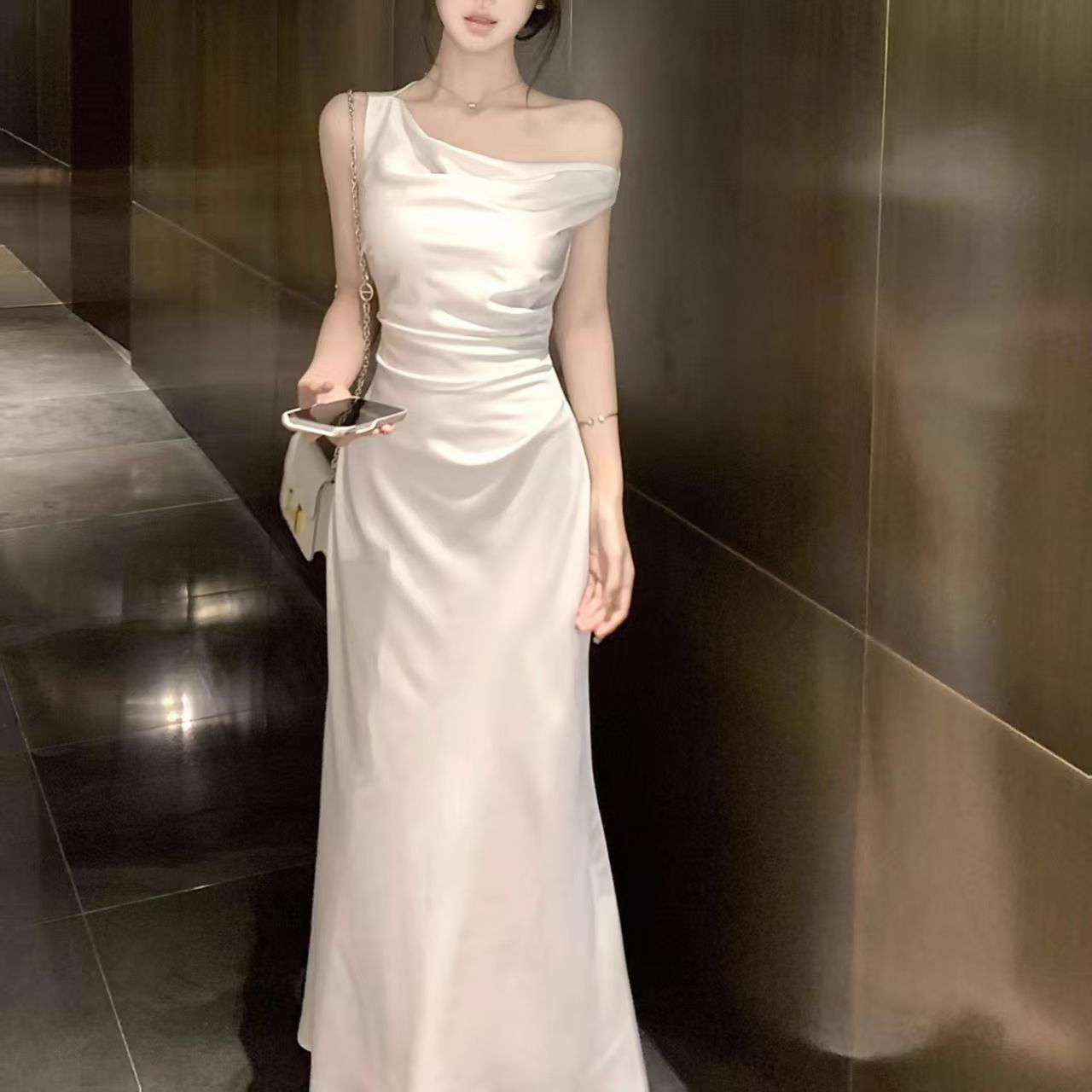フランス式のお姉さんの気質のサテンのワンピース2025新型の夏の高級感の斜めの肩の襟のドレスの魚尾のスカートの女性