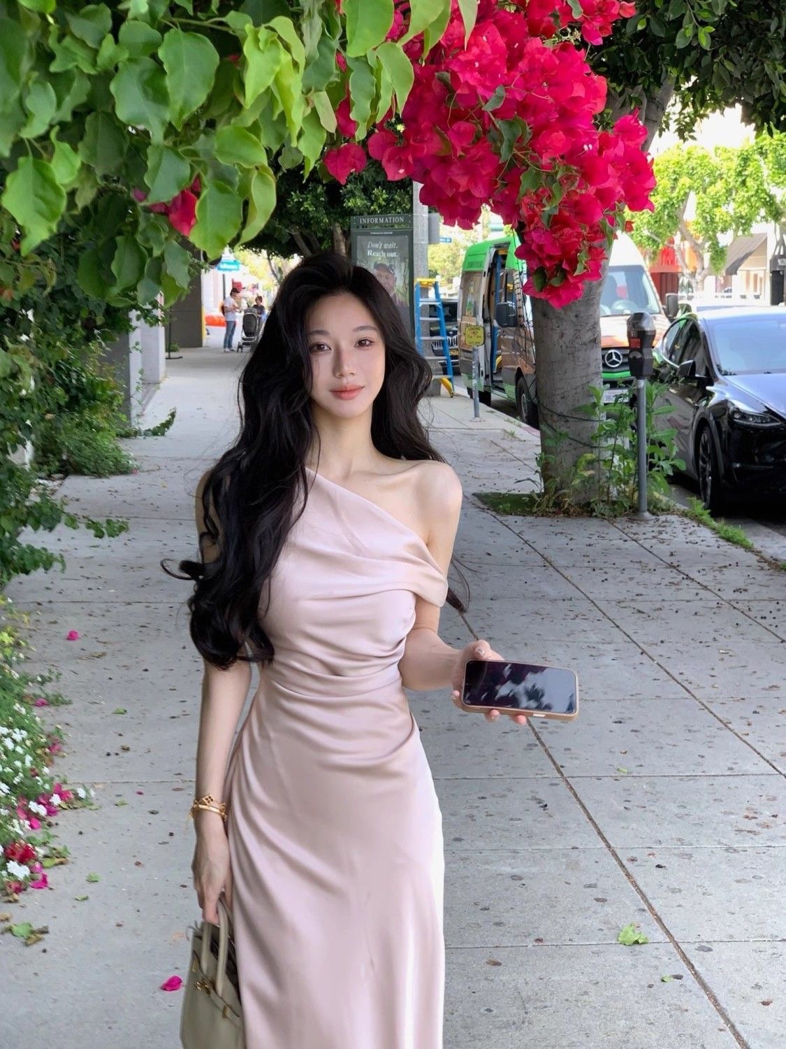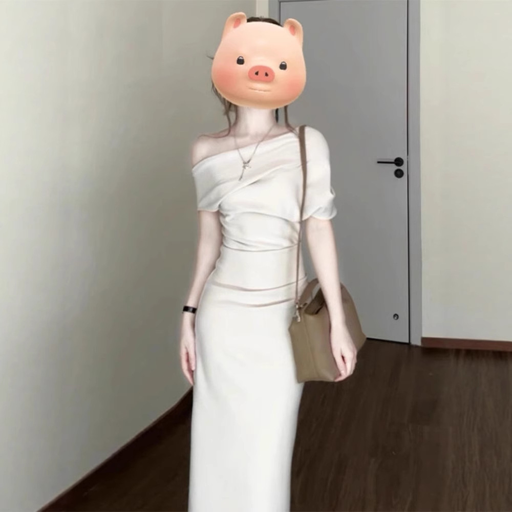 フレンチワンショルダーの新しい韓国スタイルの斜め肩の女性用ドレス、夏の気質、スリムフィットのヒップカバーロングスカート