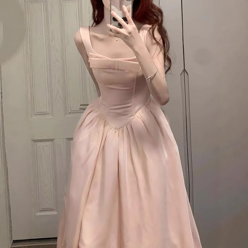 ピンクの魚の骨のワンピースの女性2025新型のフランスの重工の王女のスカートの蝶結びの気質の誕生日のドレスのスカート
