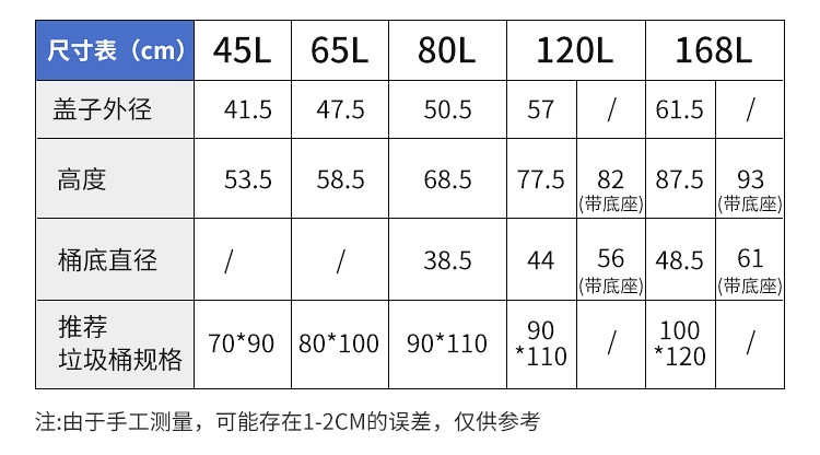 颜色 80升桶-无轮无盖-灰色,80升桶-无轮带盖-灰色,80升桶-带轮无盖-灰色,80升桶-带轮带盖-灰色,120升桶-无轮无盖-灰色,120升桶-无轮带盖-灰色,120升桶-带轮无盖-灰色,120升桶-带轮带盖-灰色,160升桶-无轮无盖-灰色,160升桶-无轮带盖-灰色,160升桶-带轮无盖-灰色,160升桶-带轮带盖-灰色,38升桶-无轮带盖-灰色,120升漏斗型-灰色,120半圆头款-灰色,120升桶带盖带5轮底座,160升桶带盖带5轮底座