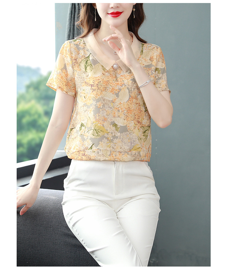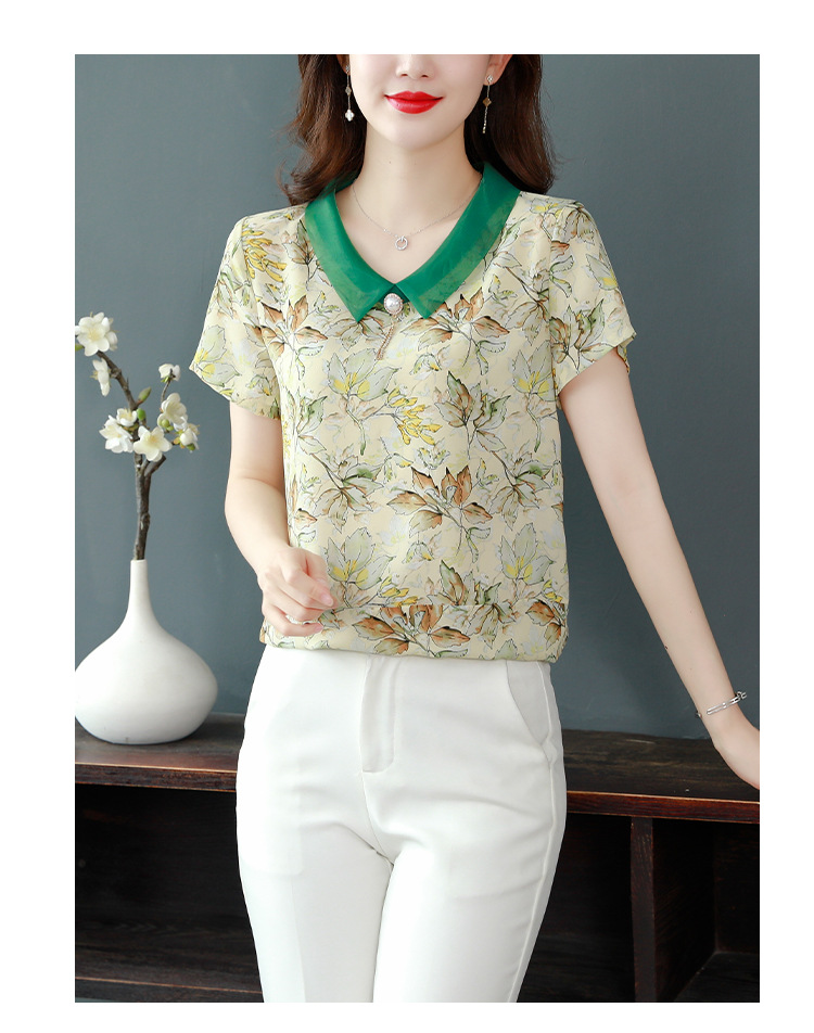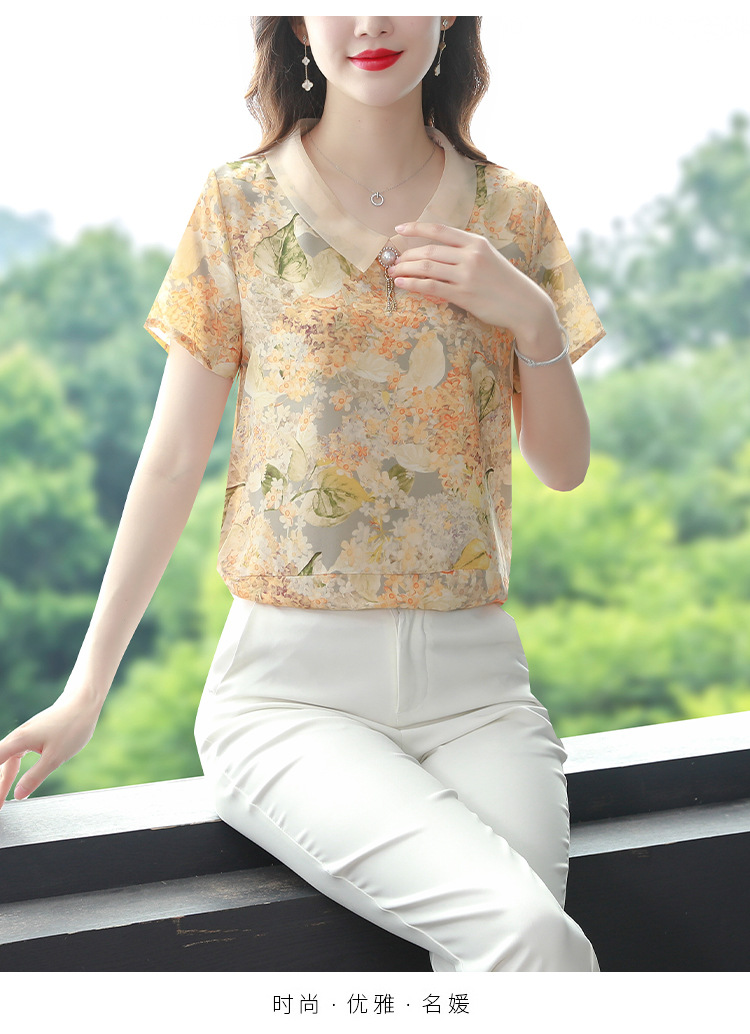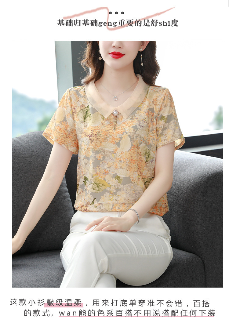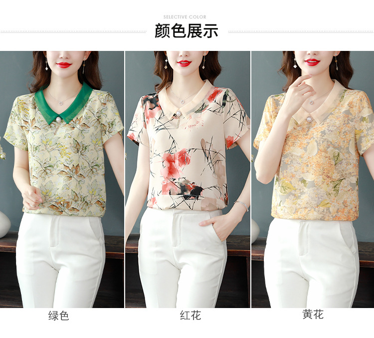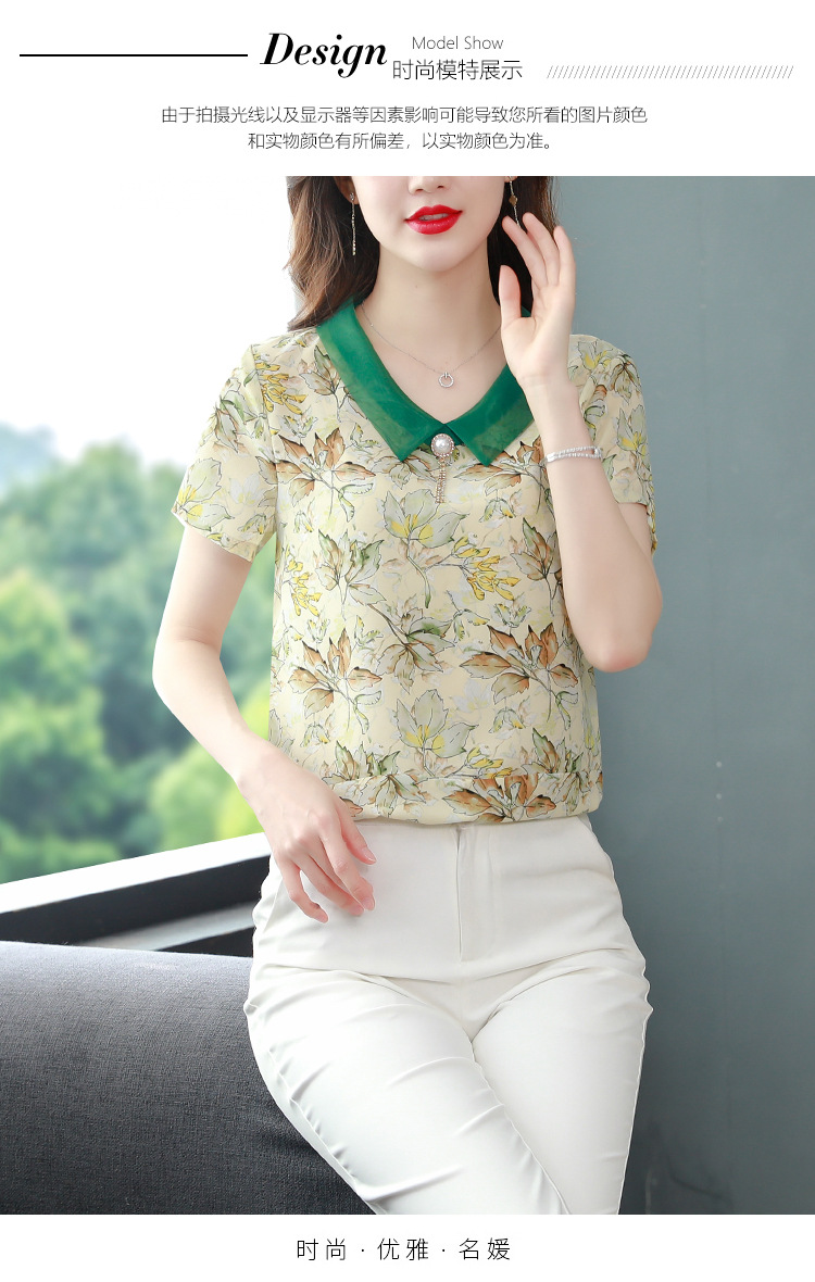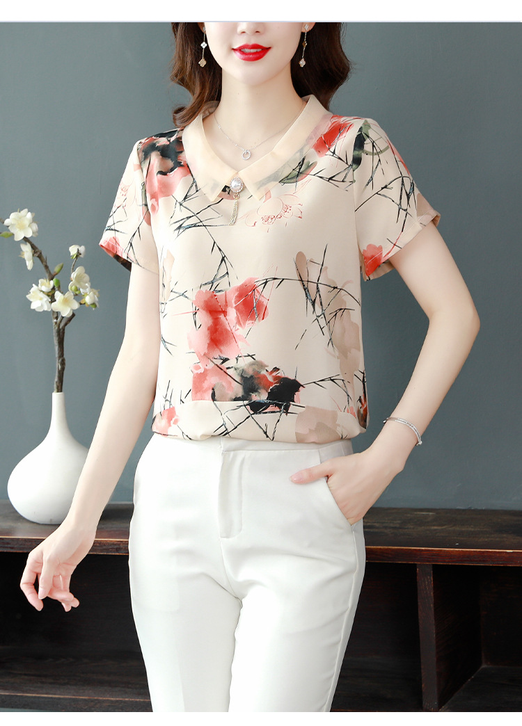 在庫あり 2023 夏の新スタイルベビードール襟プリント半袖シフォンシャツはお腹をカバーし、スリムに見えます女性の万能トップスとシャツ