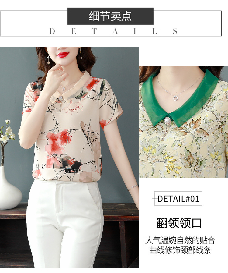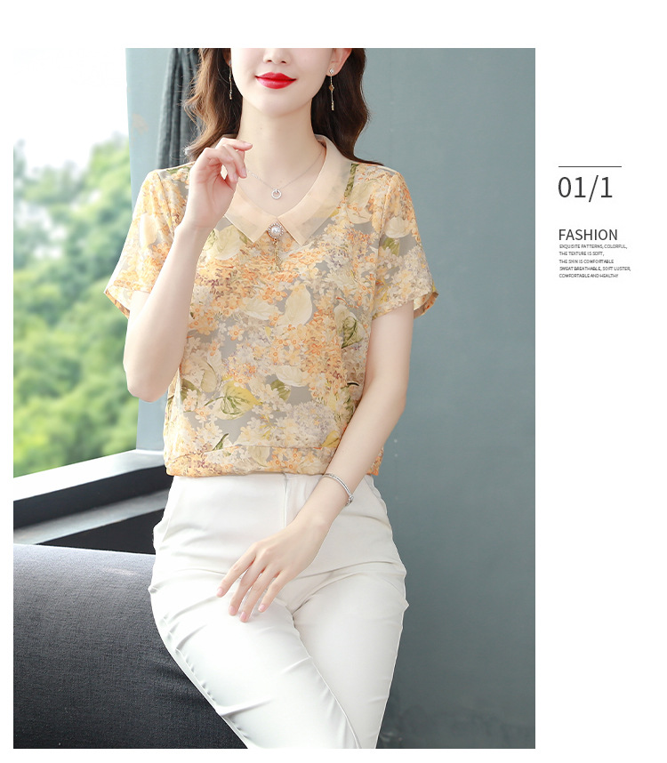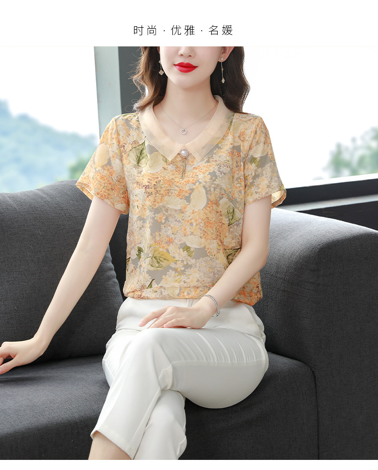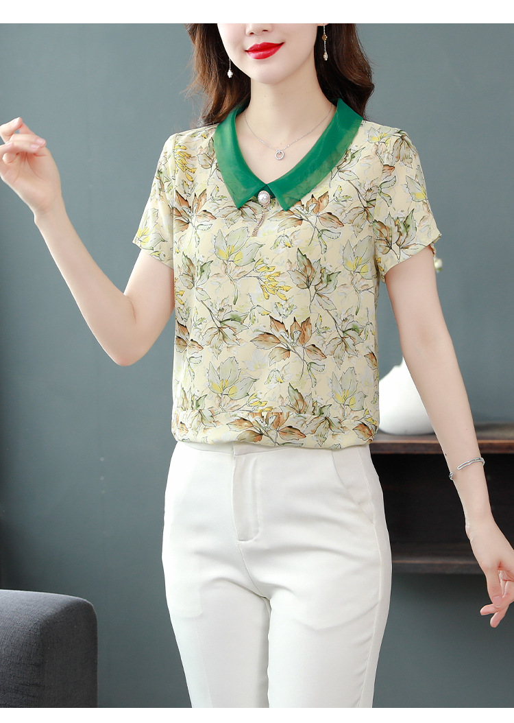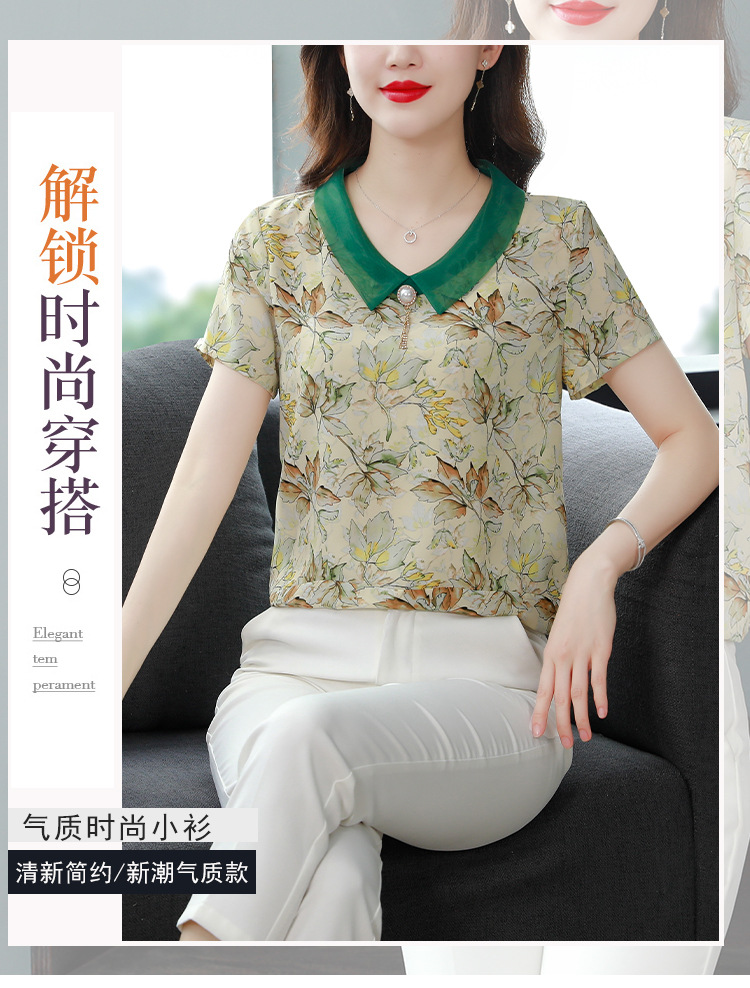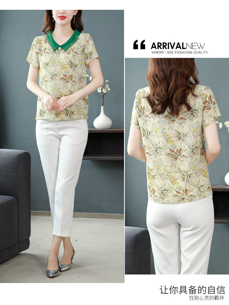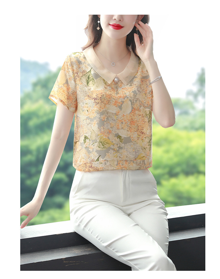 在庫あり 2023 夏の新スタイルベビードール襟プリント半袖シフォンシャツはお腹をカバーし、スリムに見えます女性の万能トップスとシャツ