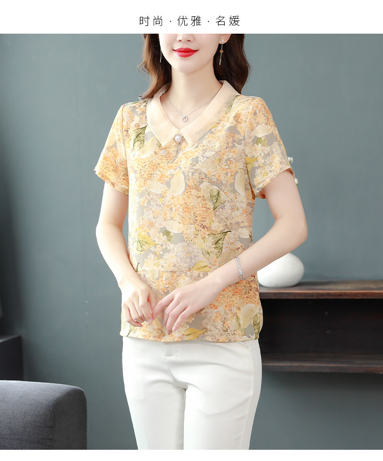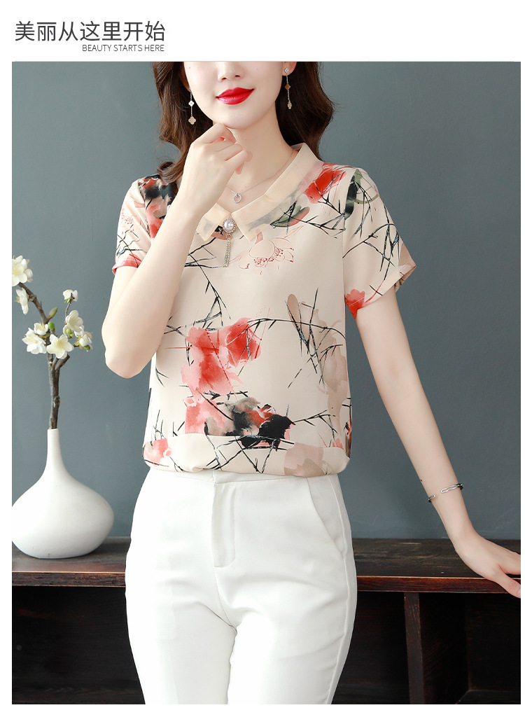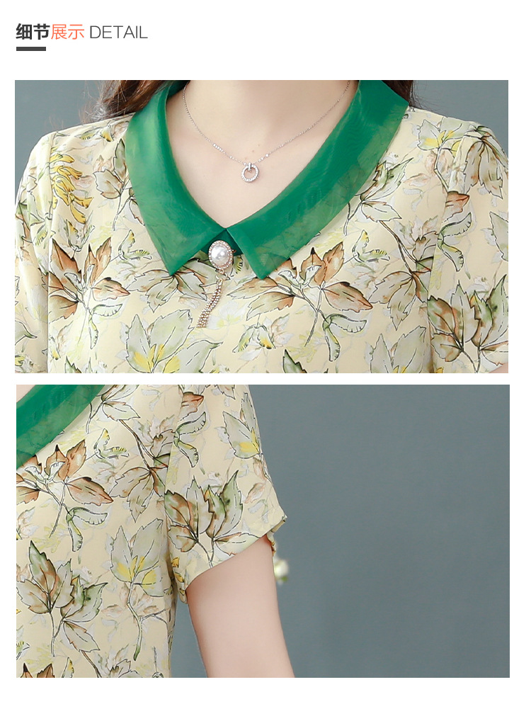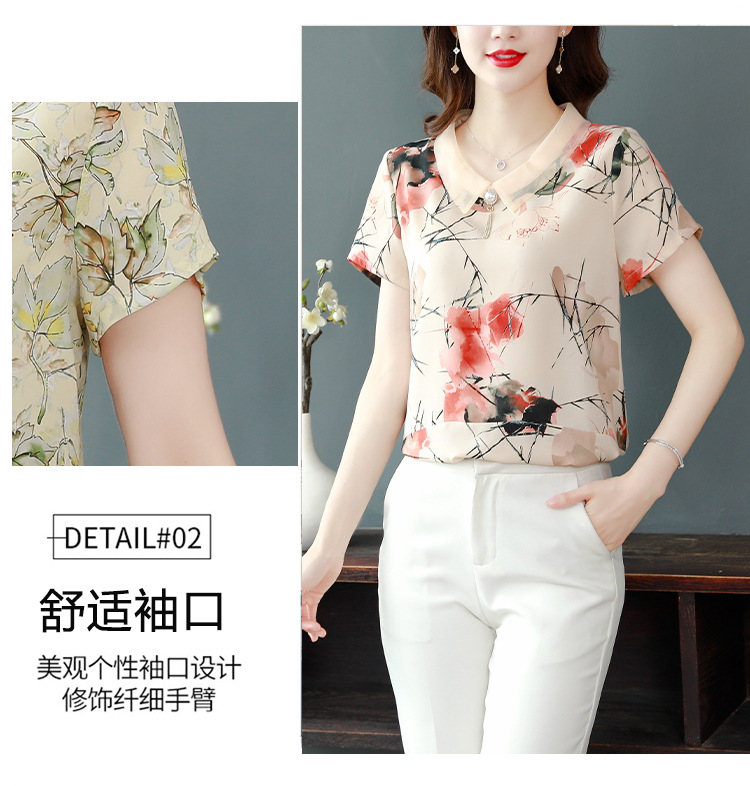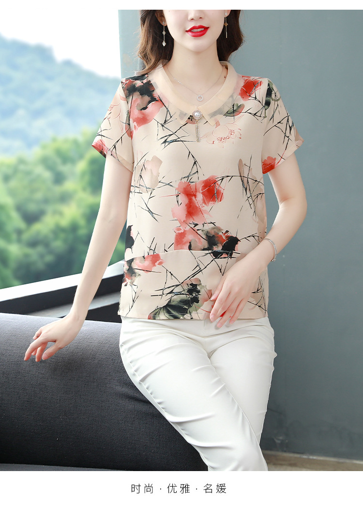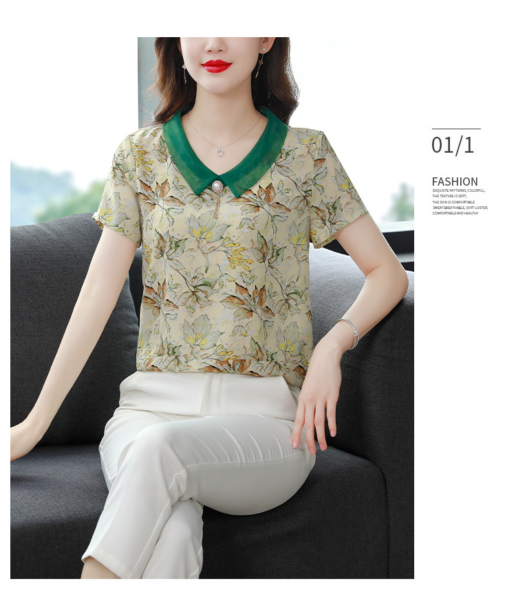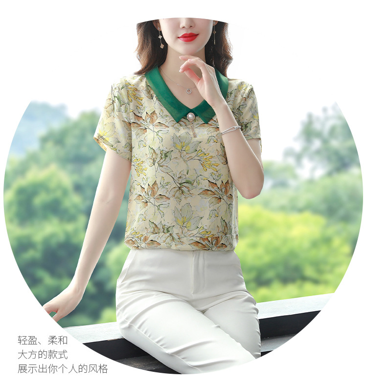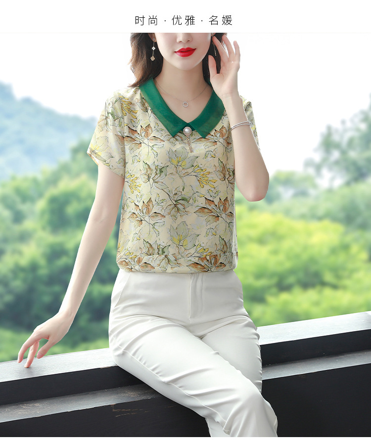 在庫あり 2023 夏の新スタイルベビードール襟プリント半袖シフォンシャツはお腹をカバーし、スリムに見えます女性の万能トップスとシャツ