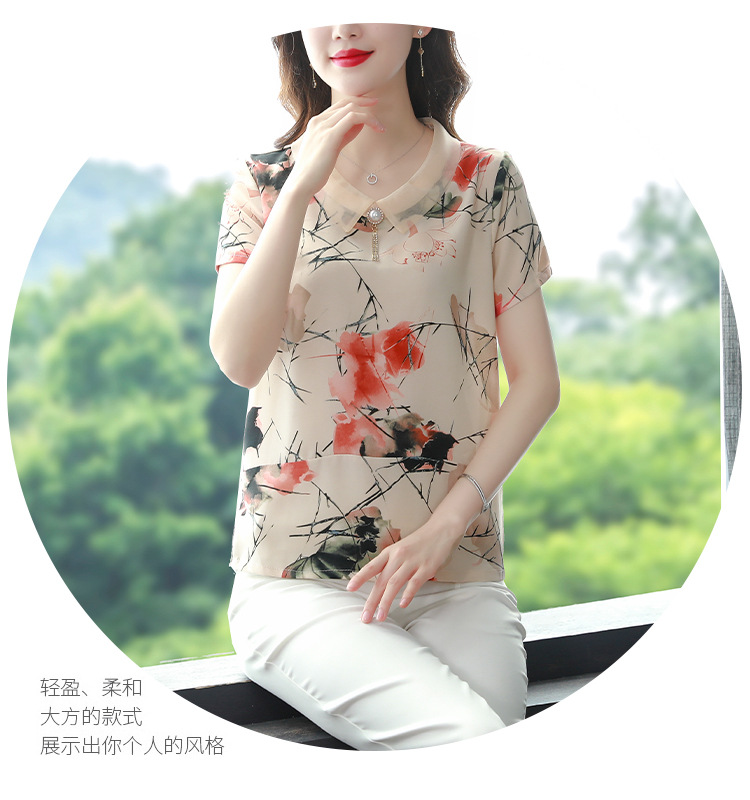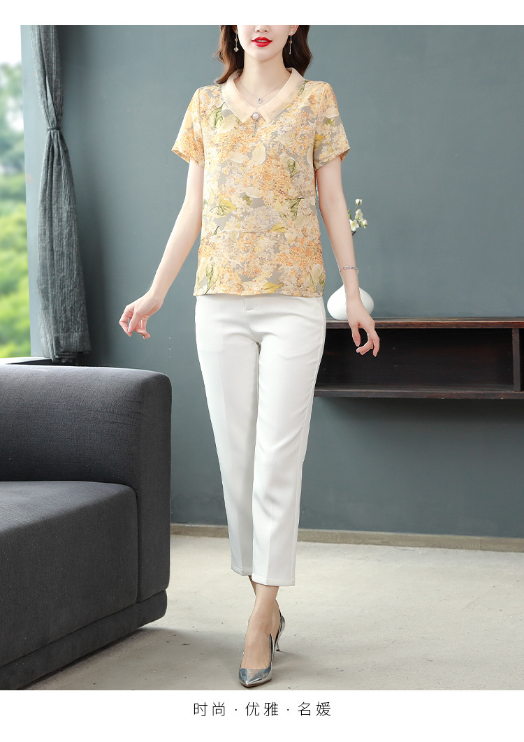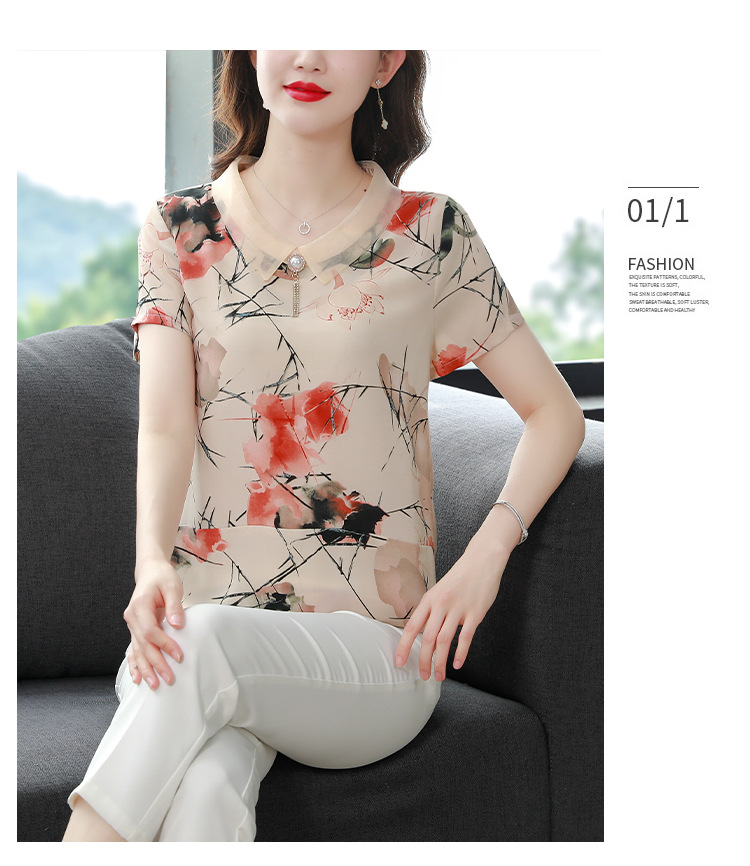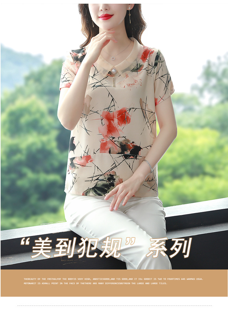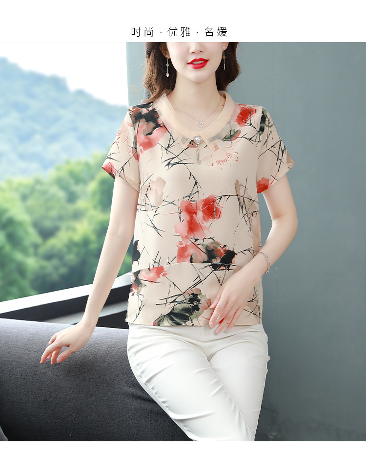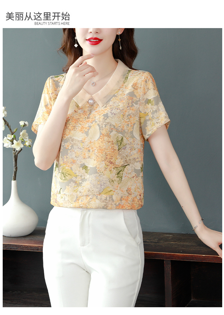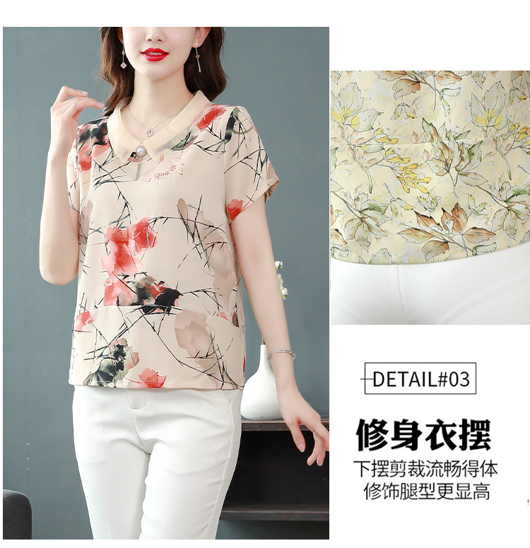 在庫あり 2023 夏の新スタイルベビードール襟プリント半袖シフォンシャツはお腹をカバーし、スリムに見えます女性の万能トップスとシャツ