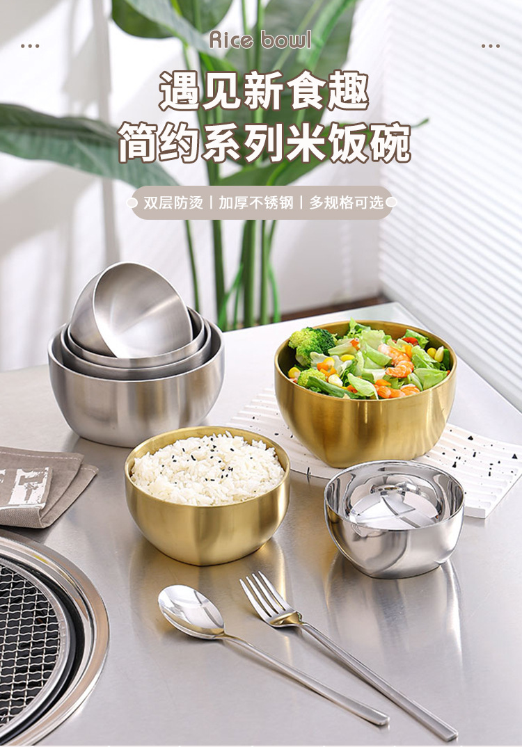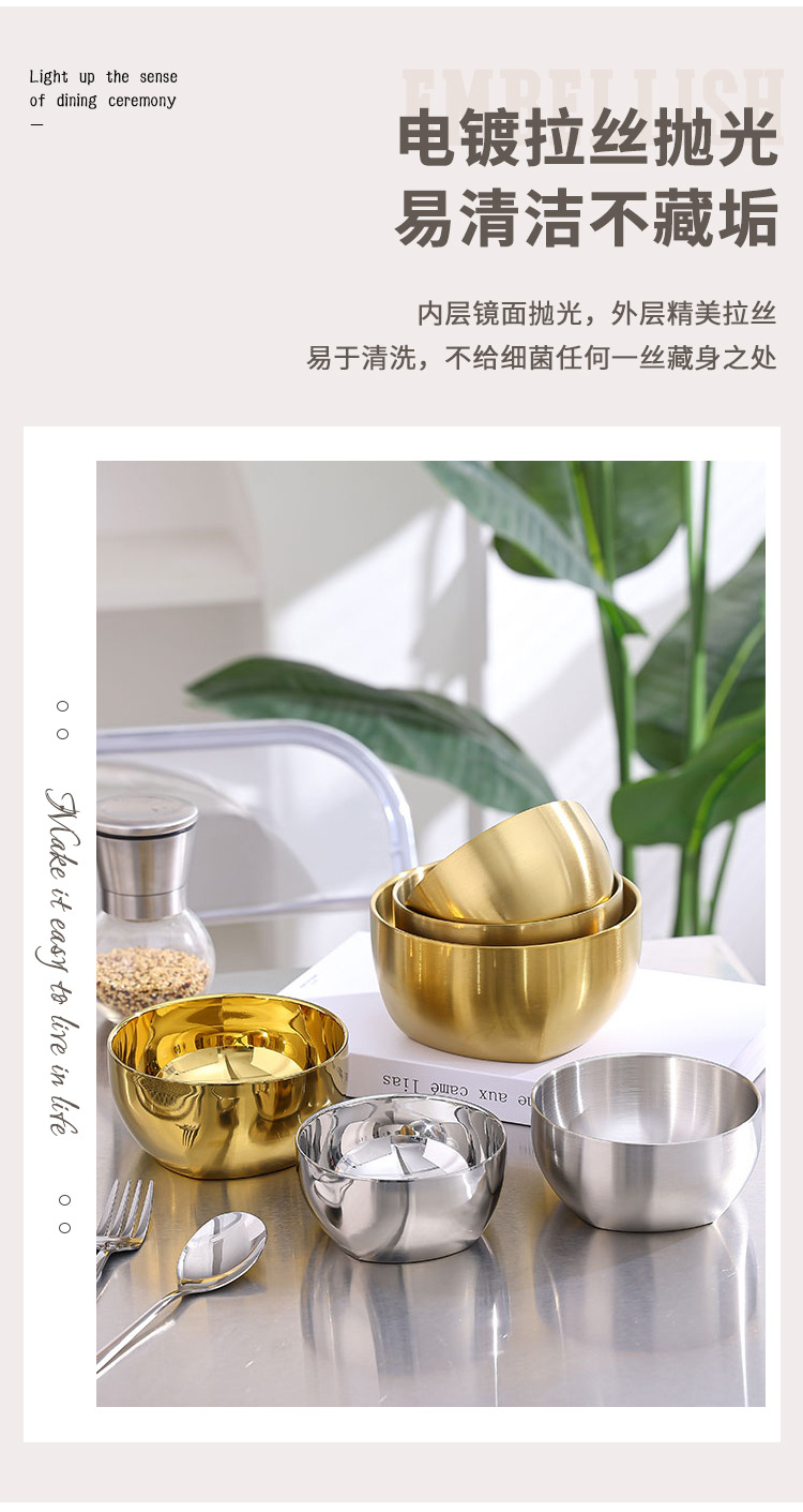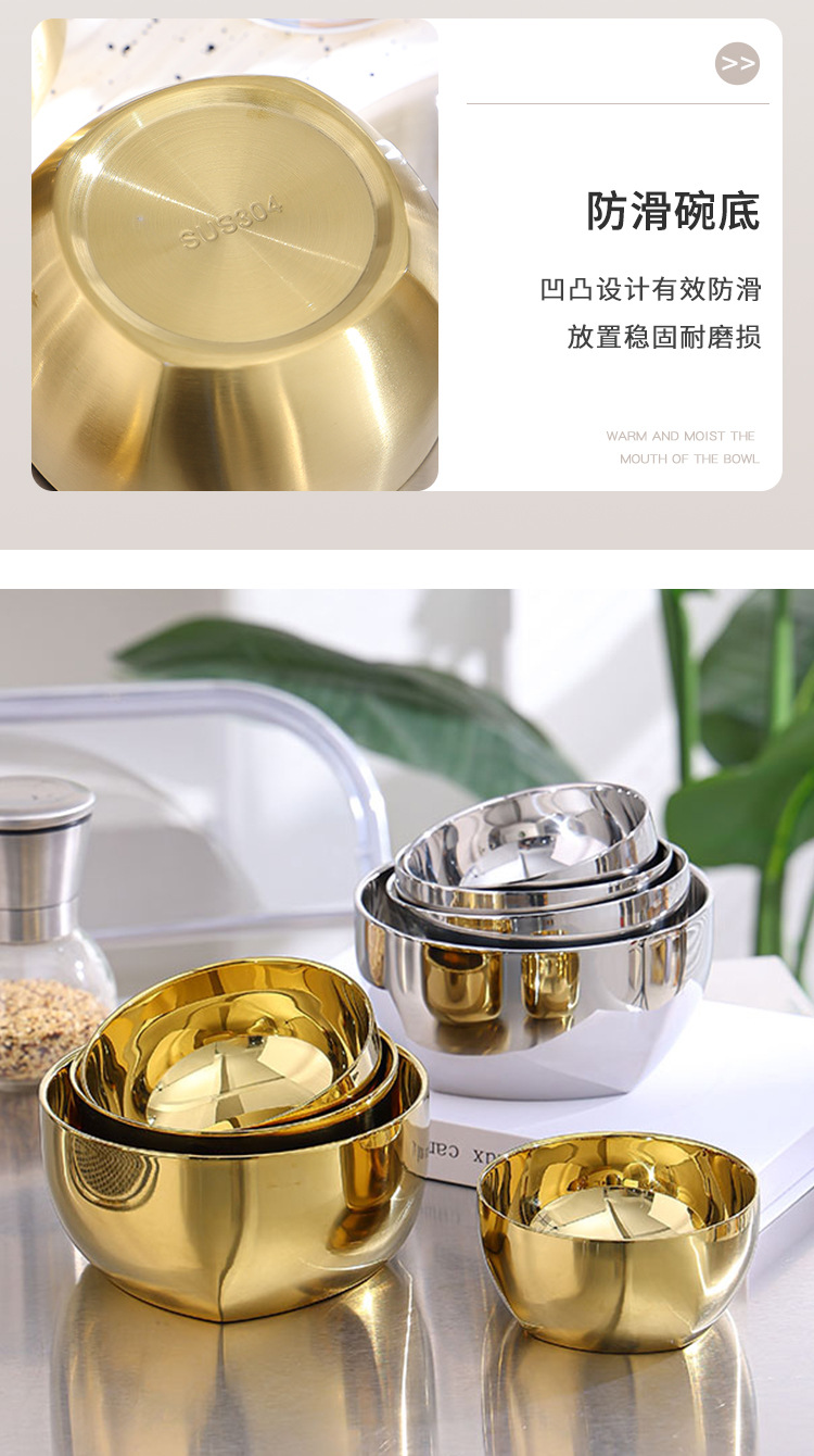 韩式304不锈钢米饭碗双层防烫汤碗儿童吃饭碗商用金色碗定制logo
