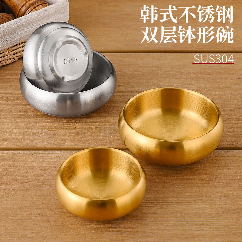 韓国式304ステンレスのご飯の碗の二重の熱いスープの碗の子供の食事の碗の商用の金色の料理のキムチの碗