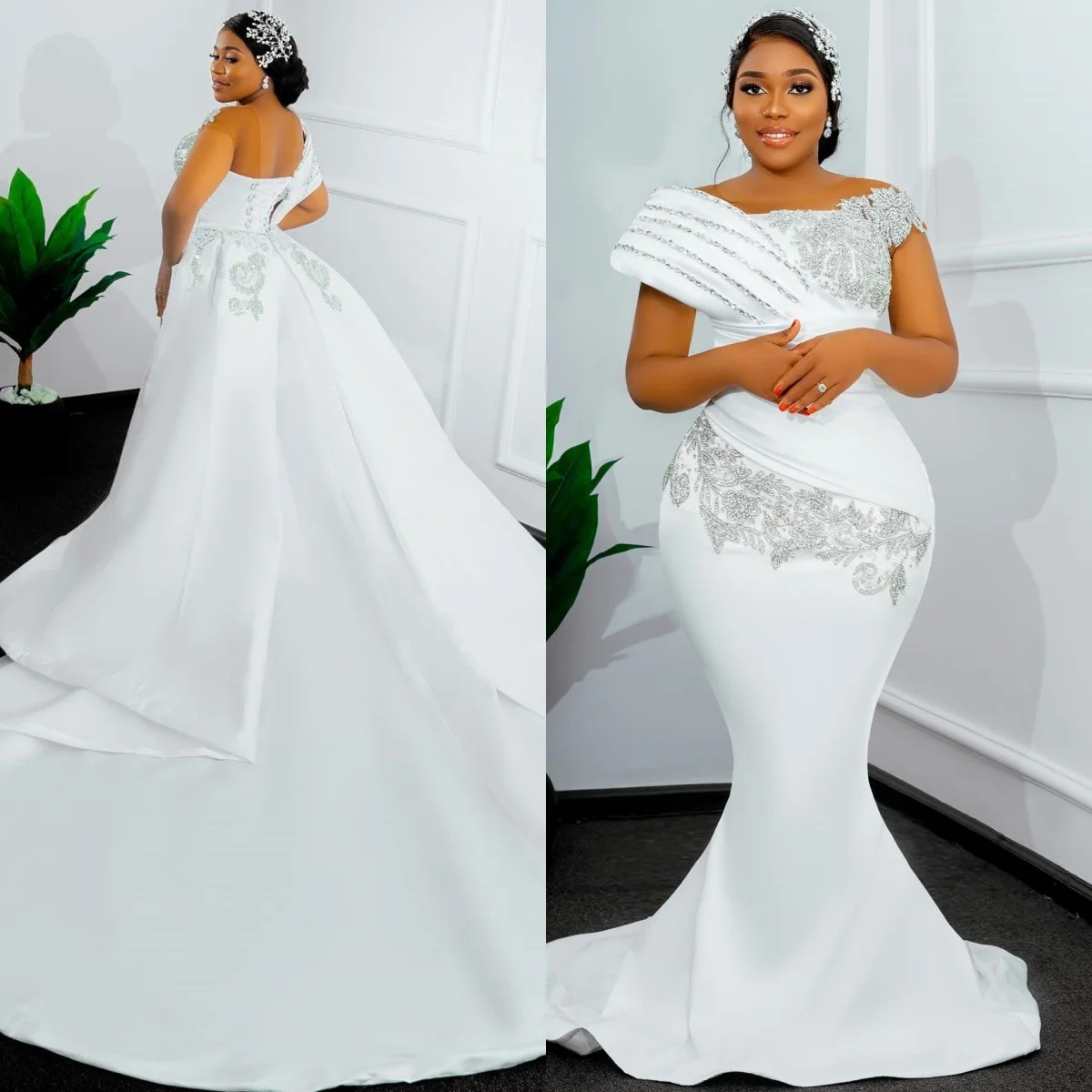 黒人女の子のためのキラキラロングマーメイドウェディングドレスオフショルダーダイヤモンドブライダルドレススイープトレインローブ