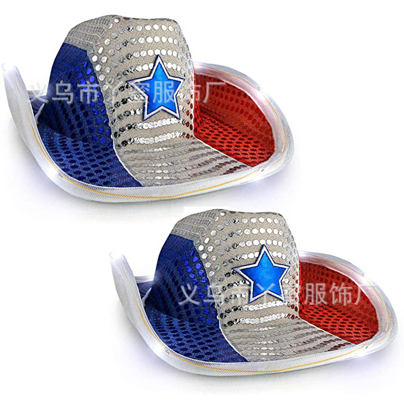 在庫あり独立記念日アメリカ国旗ライト付きスパンコール付きカウボーイハットステッチカラーLEDライトカラフルな五芒星カウボーイハット