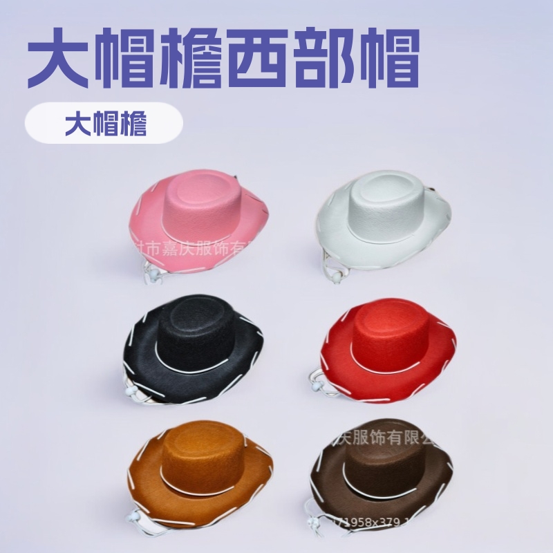 厂家批发棕色大帽檐穿绳牛仔帽西部大沿帽帽子演出无纺布红色带绳