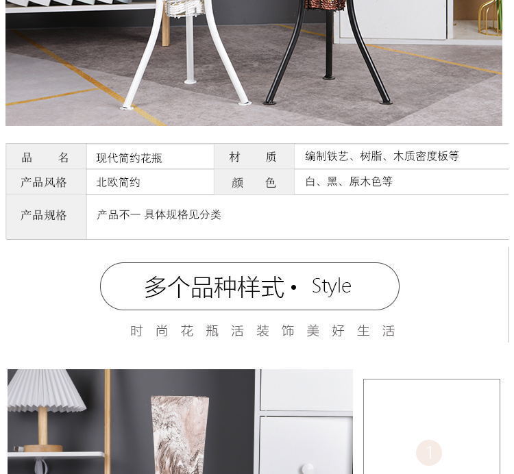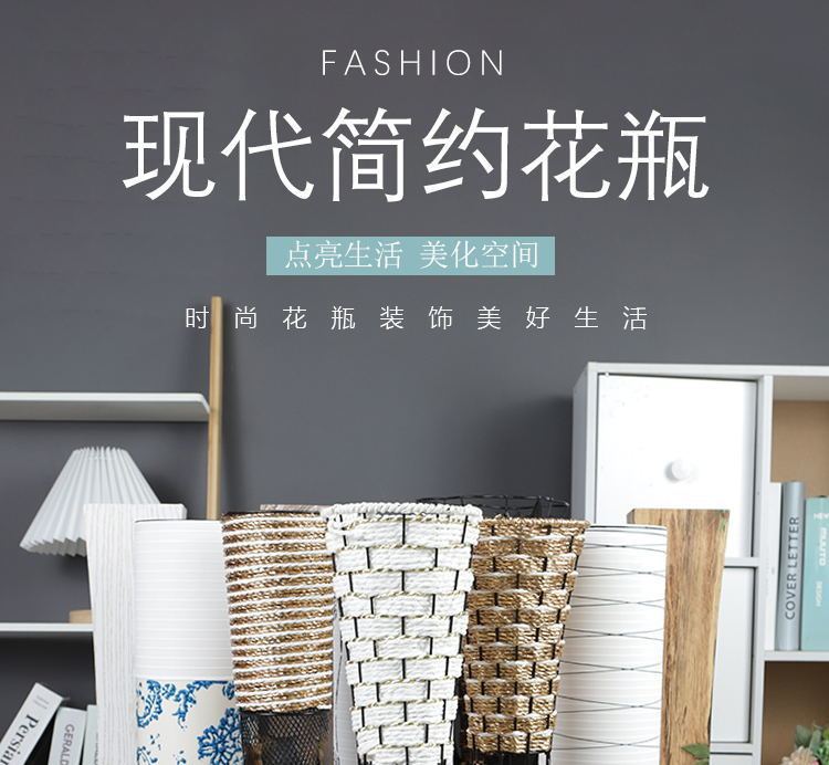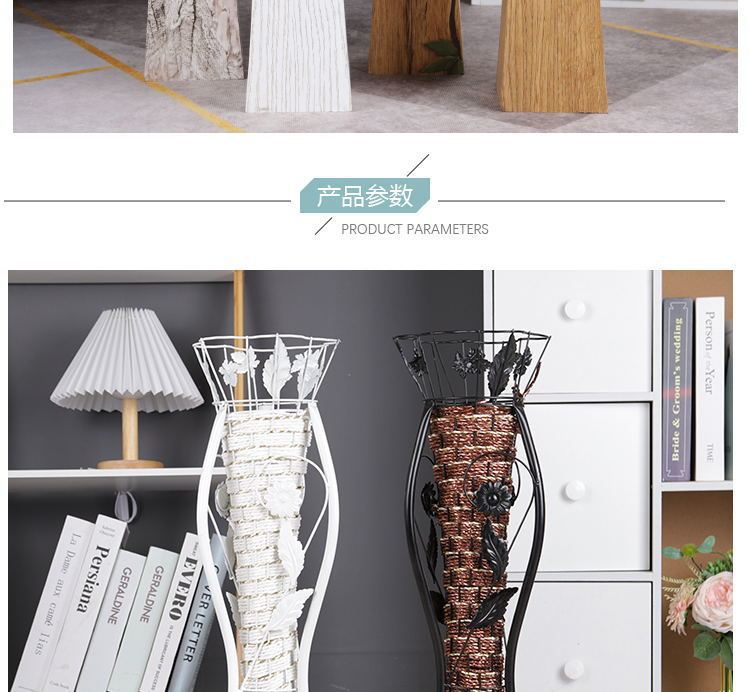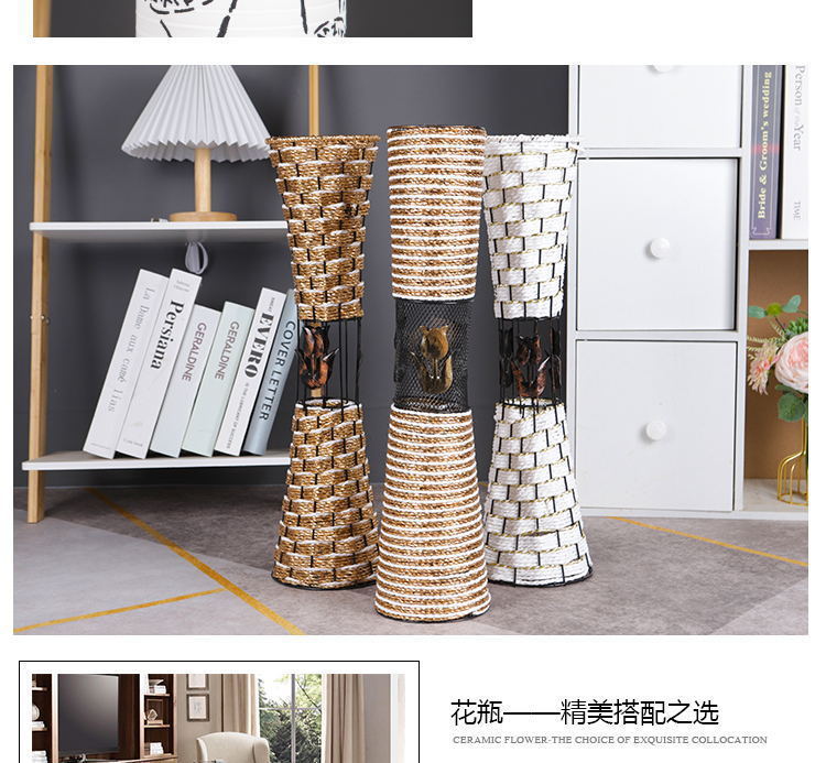 藤编铁艺简约大落地假花客厅插花盆干花落地树脂直筒花瓶装饰摆件