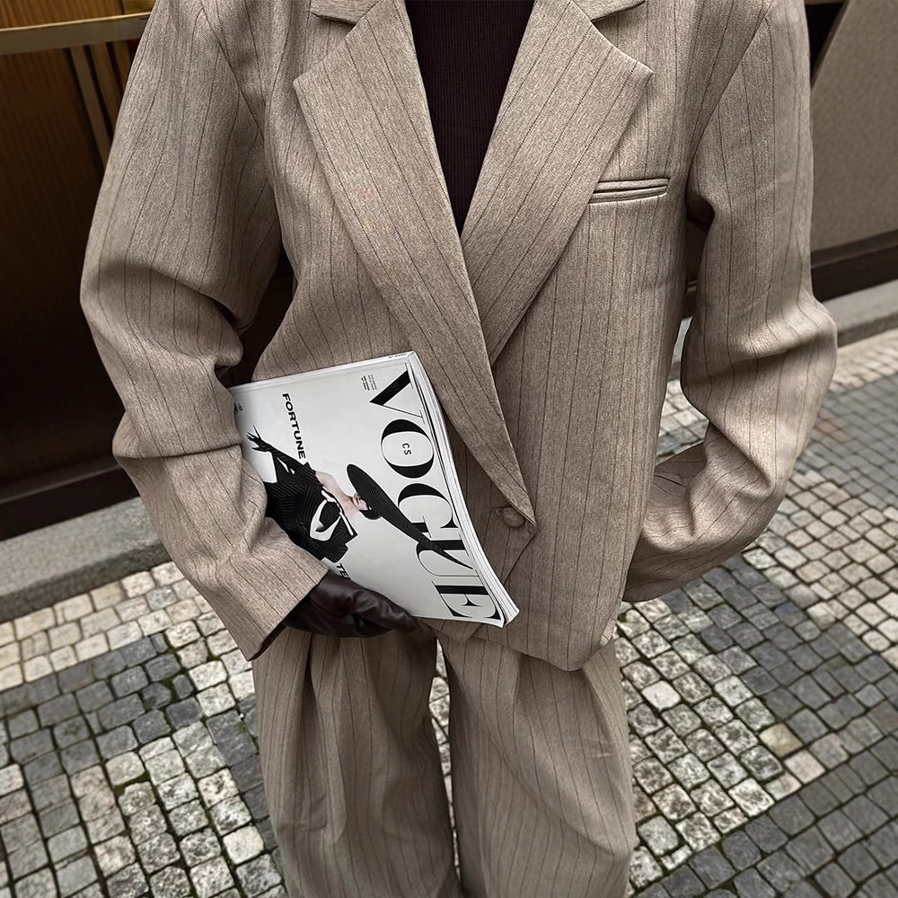 时尚英伦风条纹翻领细条纹长袖西装2025春季新款女西服跨境欧美风