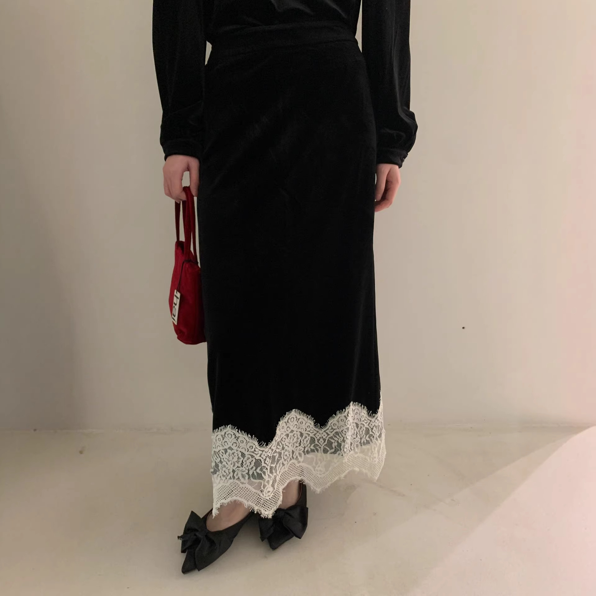 【诠释】NEWOPEN25冬法式赫本风复古蕾丝拼接高腰丝绒半裙女F7106
