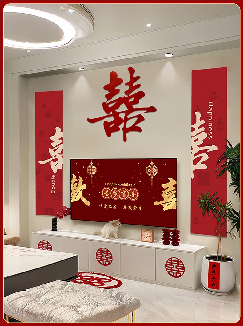 婚房布置电视机背景墙套装新房客厅男女方卧室结婚装饰婚礼喜字贴