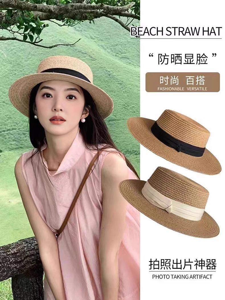 フラットトップストローハット-カードブラック-1個,フラットトップ麦わら帽子-ベージュ-1個,フラットトップ麦わら帽子-黒と白-1個