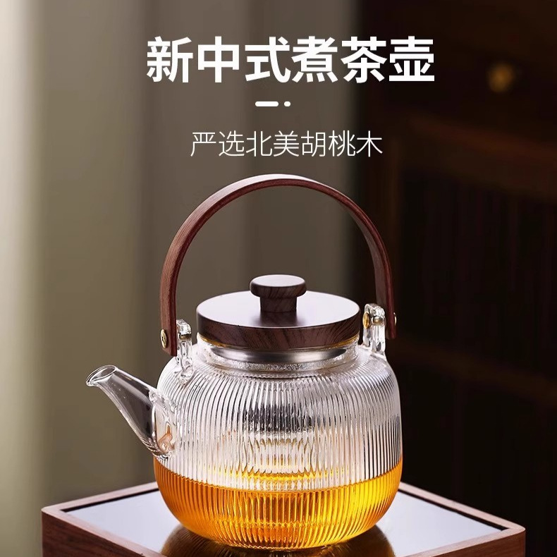 高硼硅玻璃煮茶壶耐高温蒸煮一体泡茶壶胡桃木把家用茶水分离茶壶