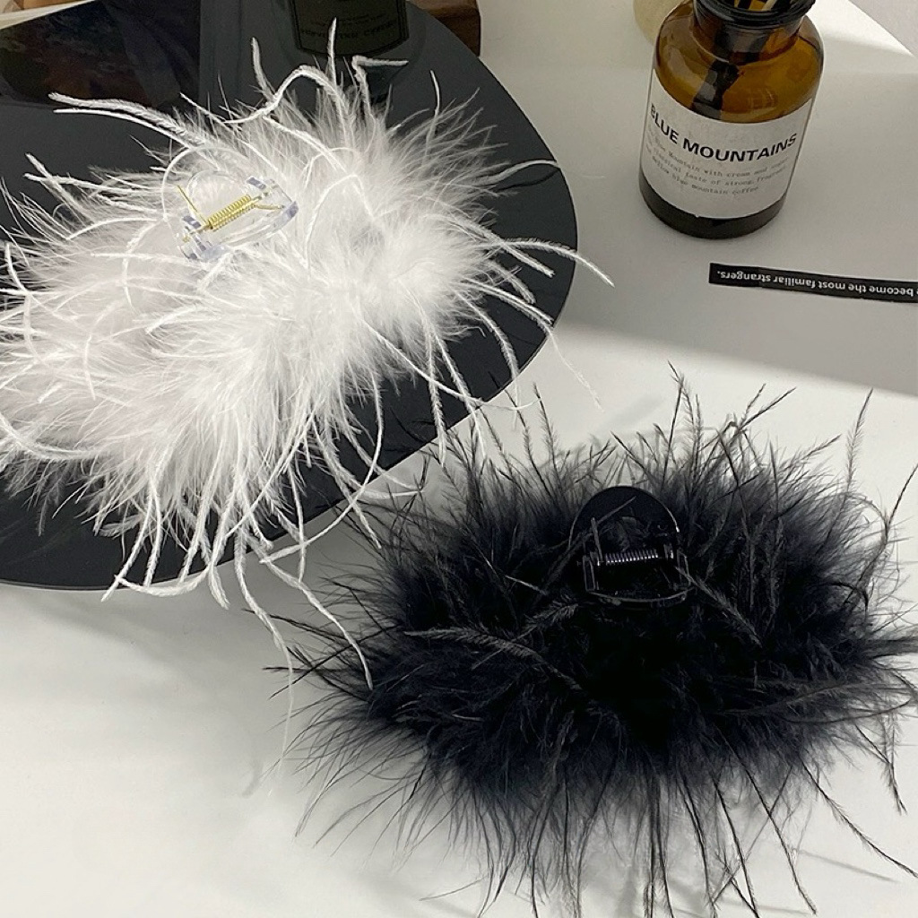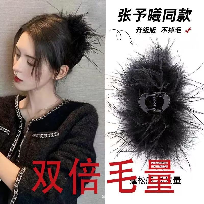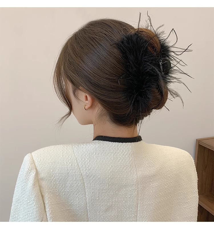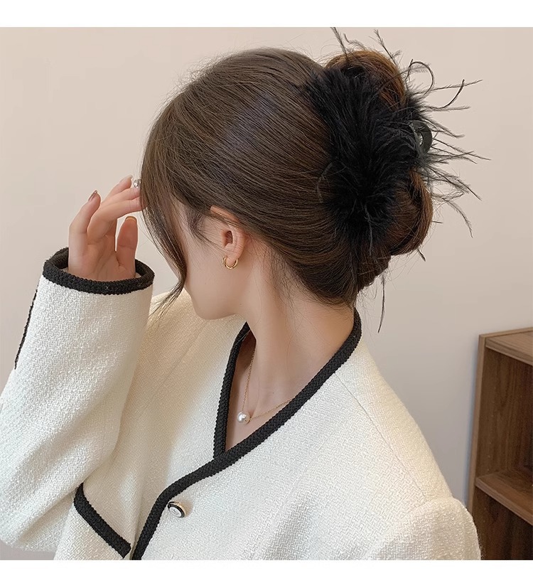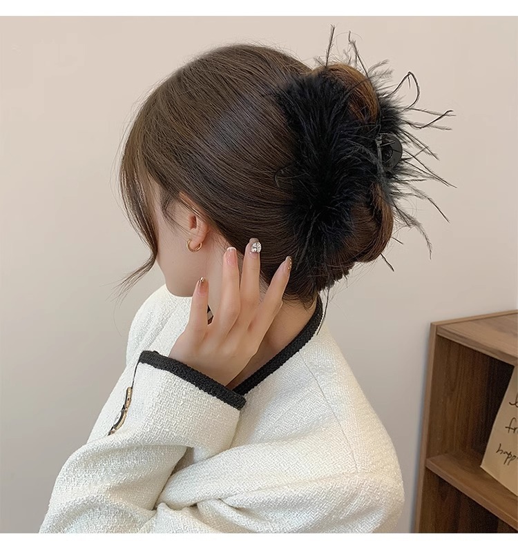 秋冬高级感鸵鸟毛鲨鱼夹女大号羽毛抓夹后脑勺毛绒发饰头夹子