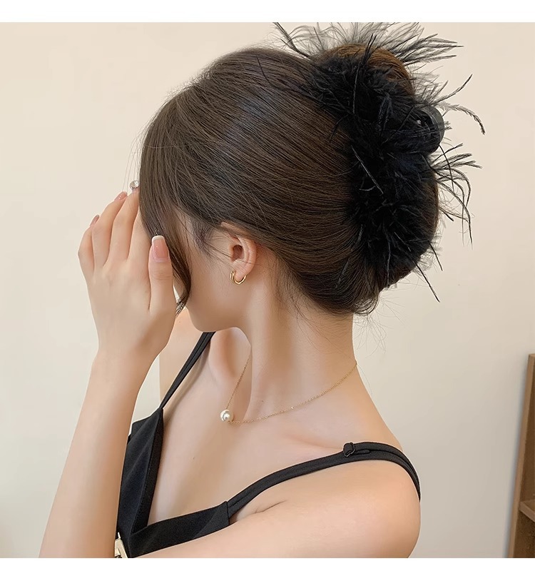 夏の新しいハイエンドオーストリッチぬいぐるみヘアクリップ女性のための大型サメクリップ黒羽グリッパー頭飾りクリップ
