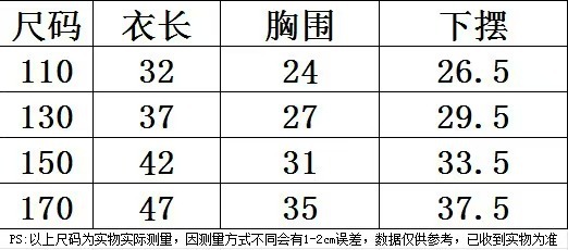 适合身高 110cm【2-3T】,130cm【4-5T】,150cm【6-7T】,170cm【7-8T】