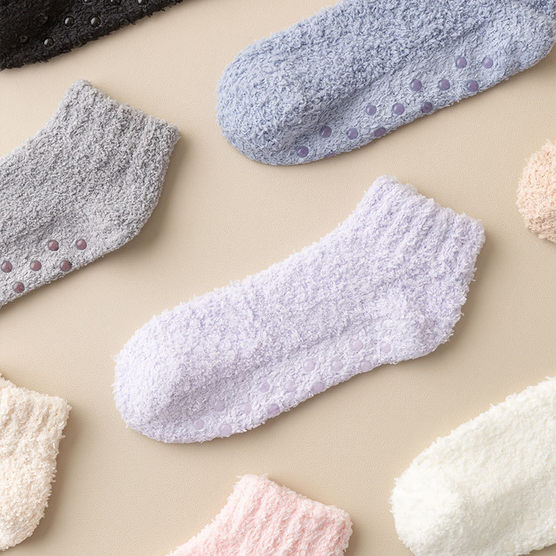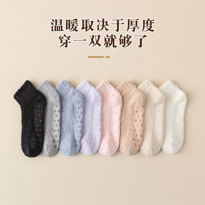 不掉毛船袜纯色珊瑚绒袜子女冬天加厚保暖脚底硅胶防滑居家地板袜