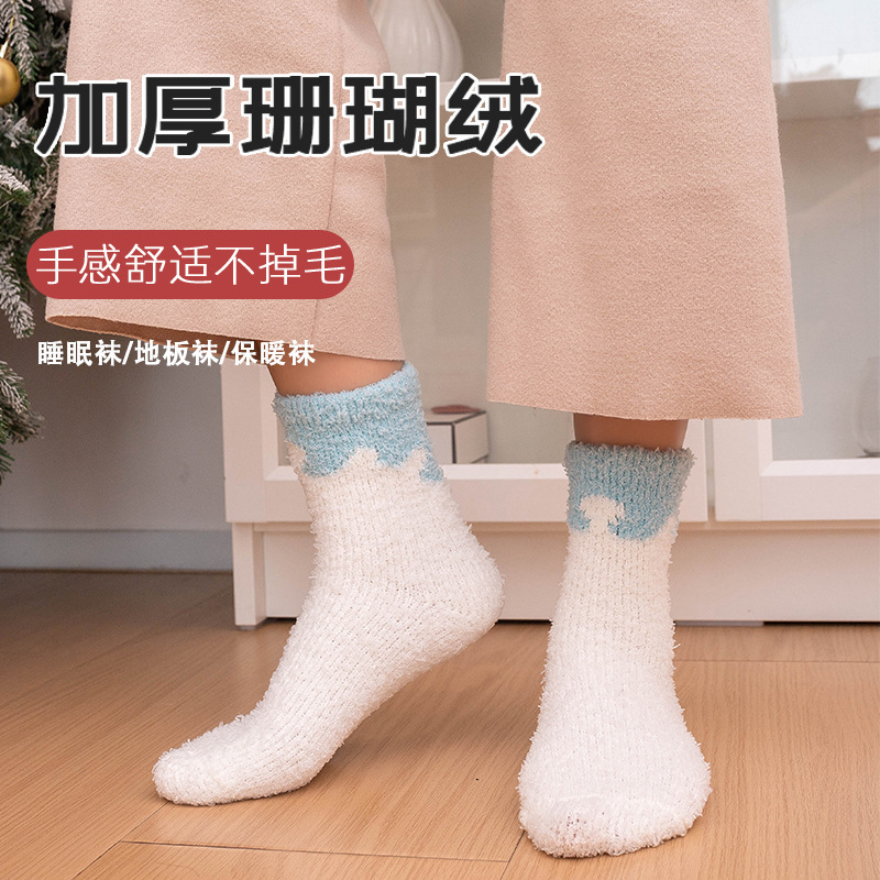 新款半边绒袜子日系花朵加厚珊瑚绒女中筒袜保暖睡眠地板袜