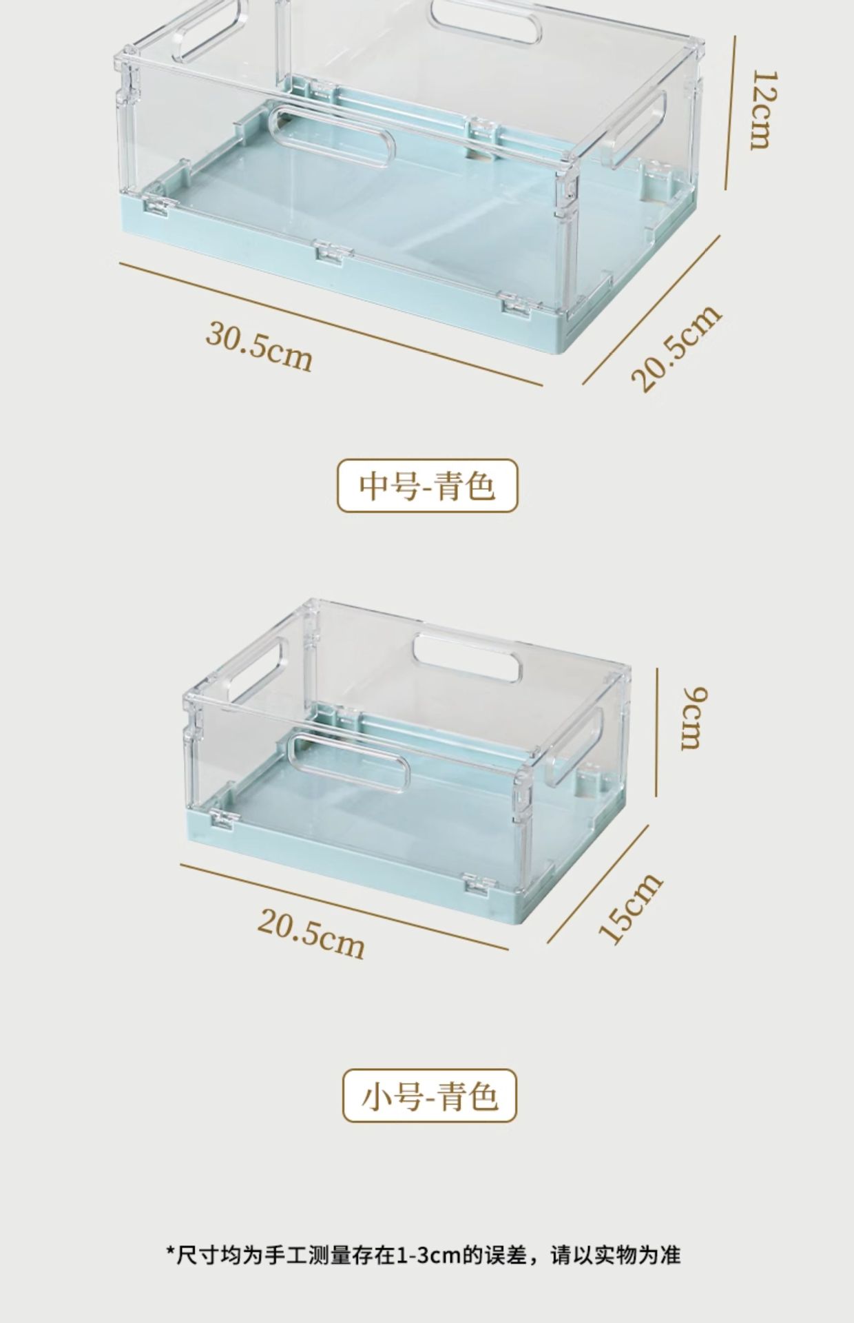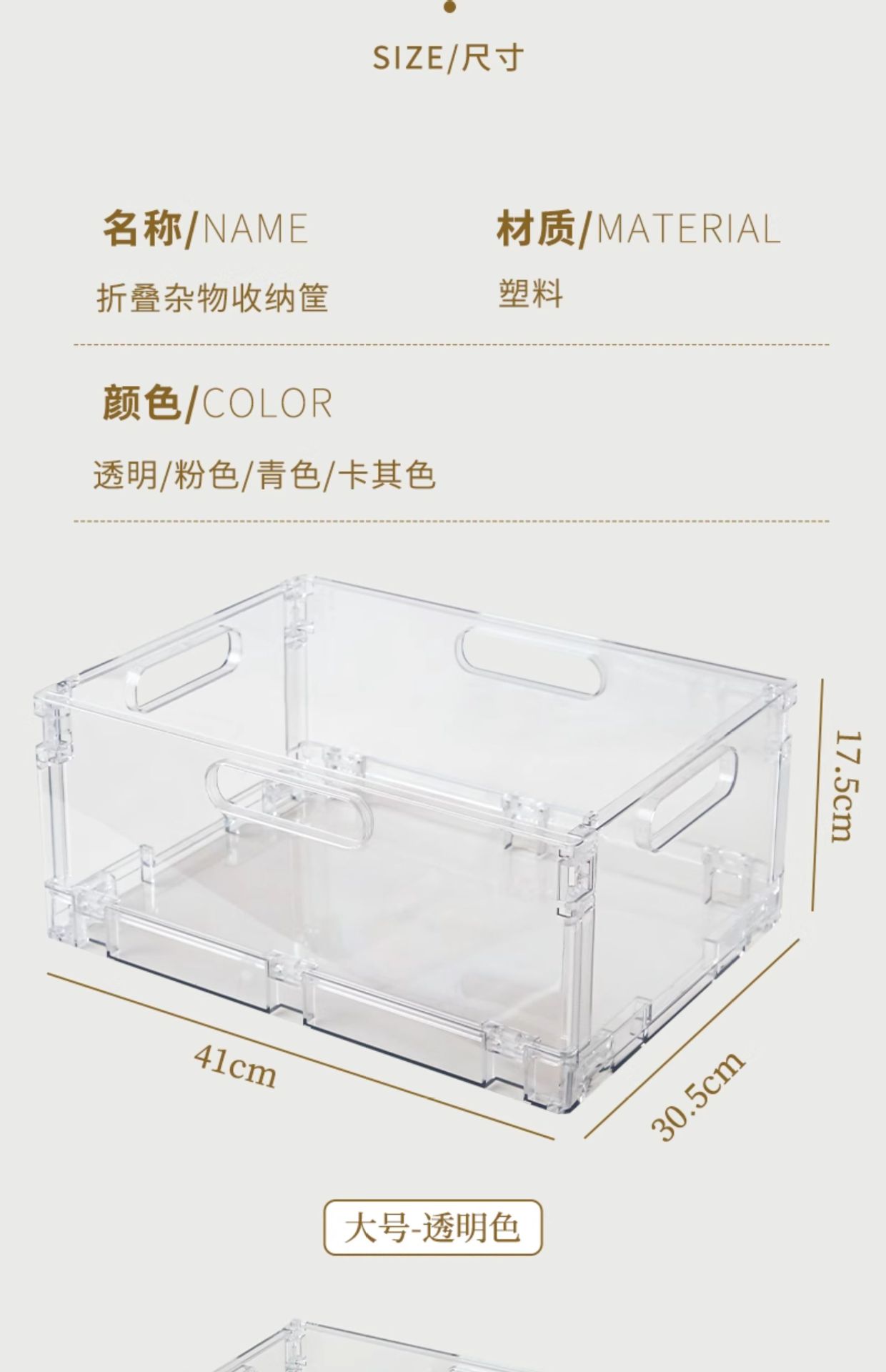 颜色 【透明—大号】长41*宽30*高17,【透明—中号】长30*宽20*高12,【粉色—中号】长30*宽20*高12,【青色—中号】长30*宽20*高12,【卡其—中号】长30*宽20*高12,【透明—小号】长20*宽15*高9,【粉色—小号】长20*宽15*高9,【卡其—小号】长20*宽15*高9