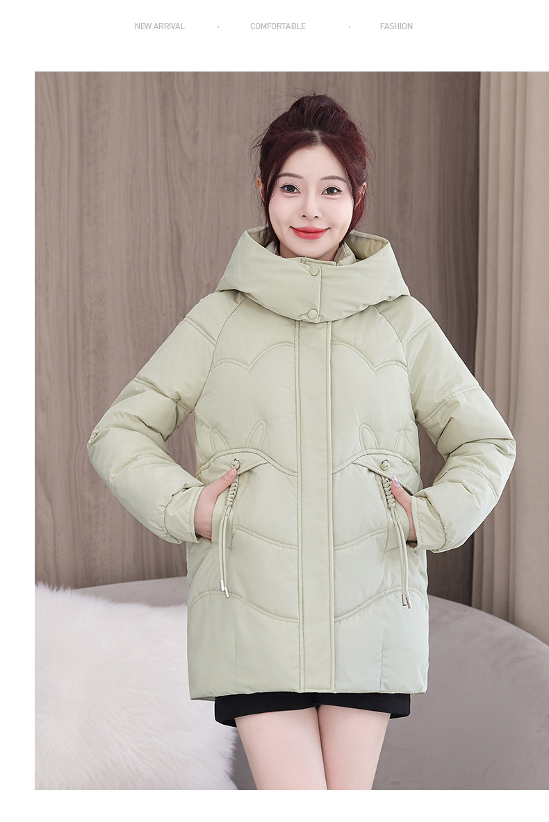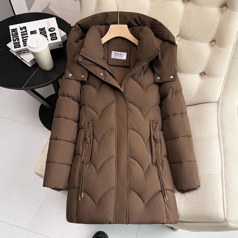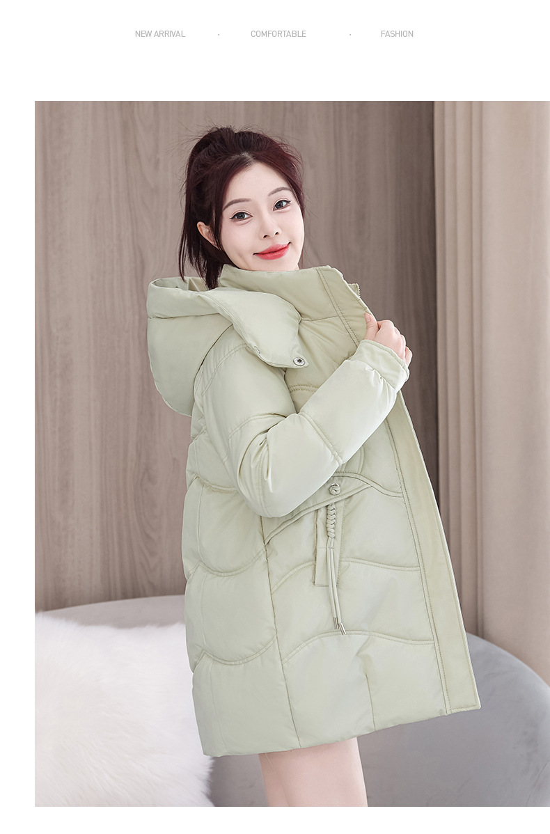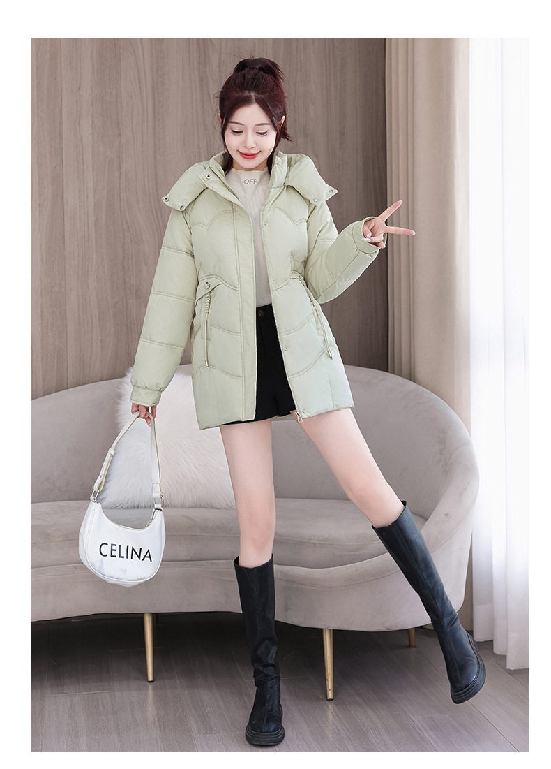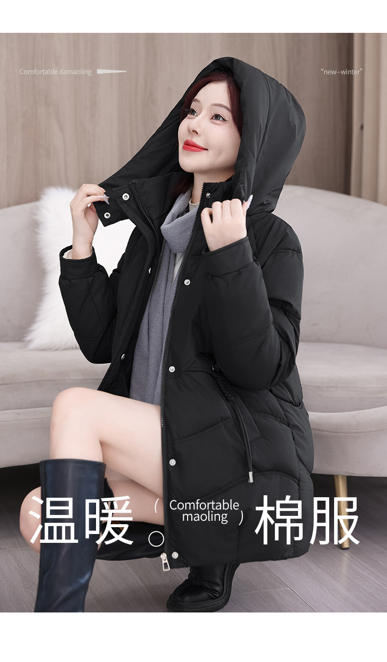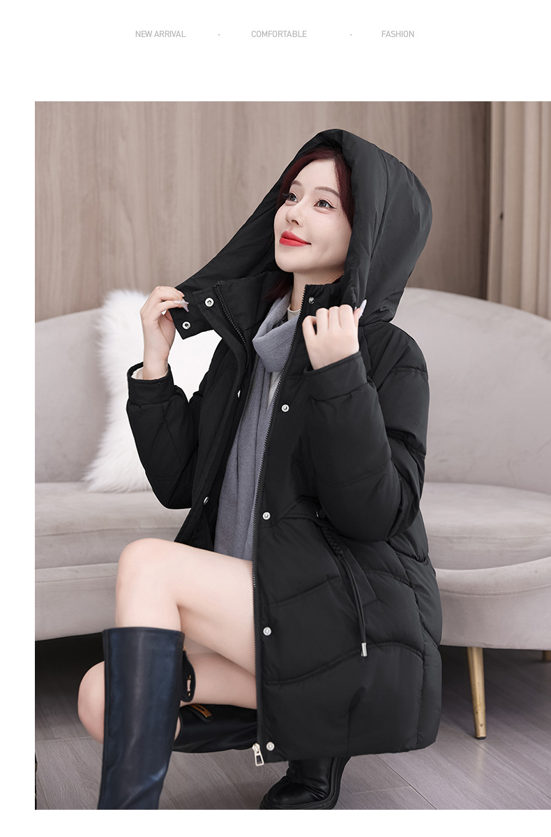 冬用レディースミドル丈中綿ジャケット、フード付き、ウエスト調節可能、保温性抜群、厚手で万能なコート、卸売、在庫あり