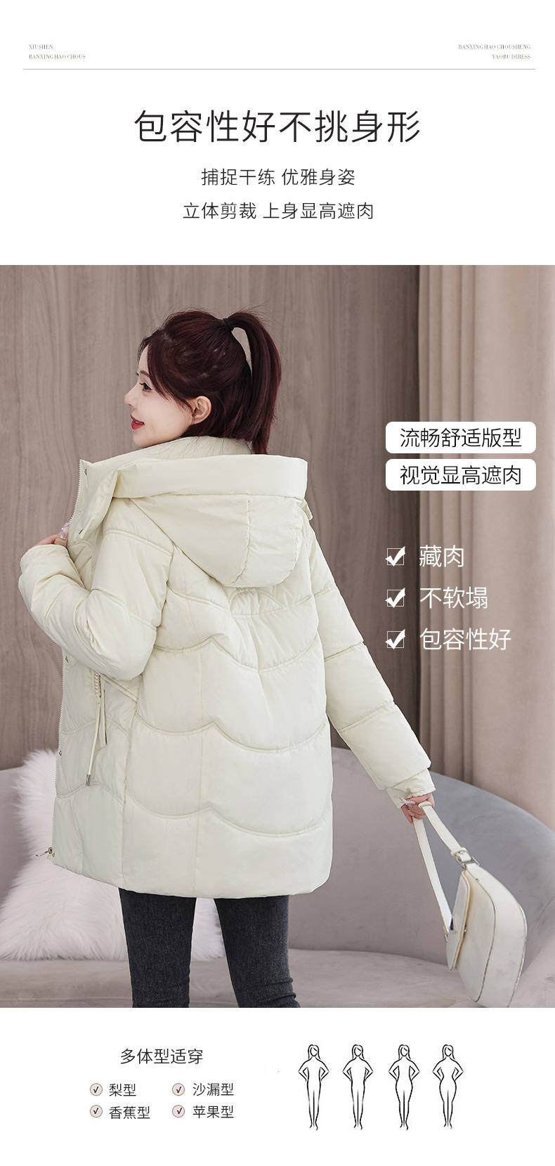 女性のための冬の厚みのあるミドル丈の綿の服 2025 新しい緩い大きいサイズのフード付き綿のジャケットファッション綿のジャケット防寒