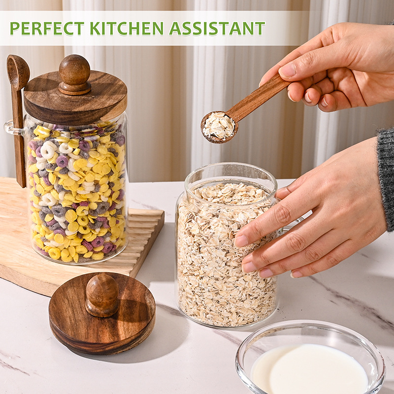 カスタマイズされたアカシア材のスプーン付き保存瓶、調味料瓶、蜂蜜瓶、高ホウケイ酸ガラスコーヒー豆保存瓶の加工
