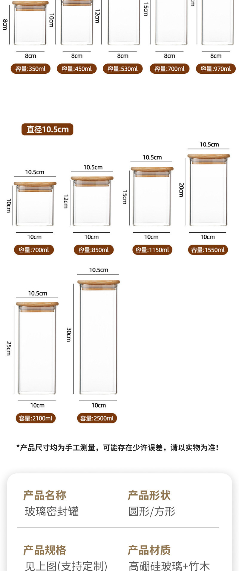 尺寸 6*8 (180ml),6*10(260ml),6*12 (320ml),6*15(410ml),6*20 (540ml),8*8(350ml),8*10 (450ml),8*12 (530ml),8*15 (700ml),8*20 (970ml),10*10 (700ml),10*12(850ml),10*15 (1150ml),10*20 (1550ml),10*25 (2100ml),10*30 (2500ml),60方盖,80方盖,100方盖