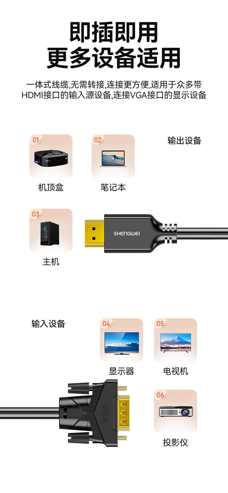 胜为hdmi线转vga 高清视频投屏hdmi转vga单向转换转接线1/1.8米