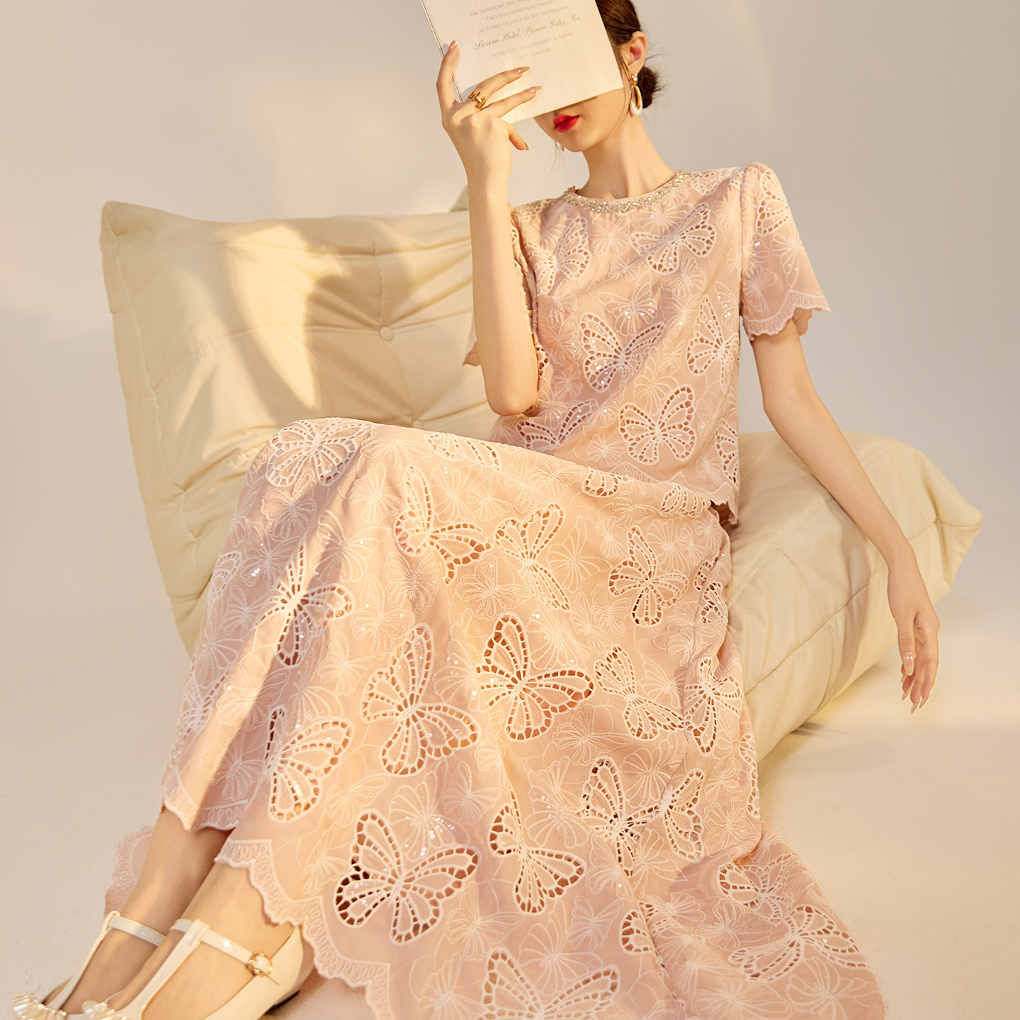 新中式春夏新作高級刺繍レースデザイントップスとウエストシェイプロングスカートのツーピースセット女性用 ZXモデルN3047